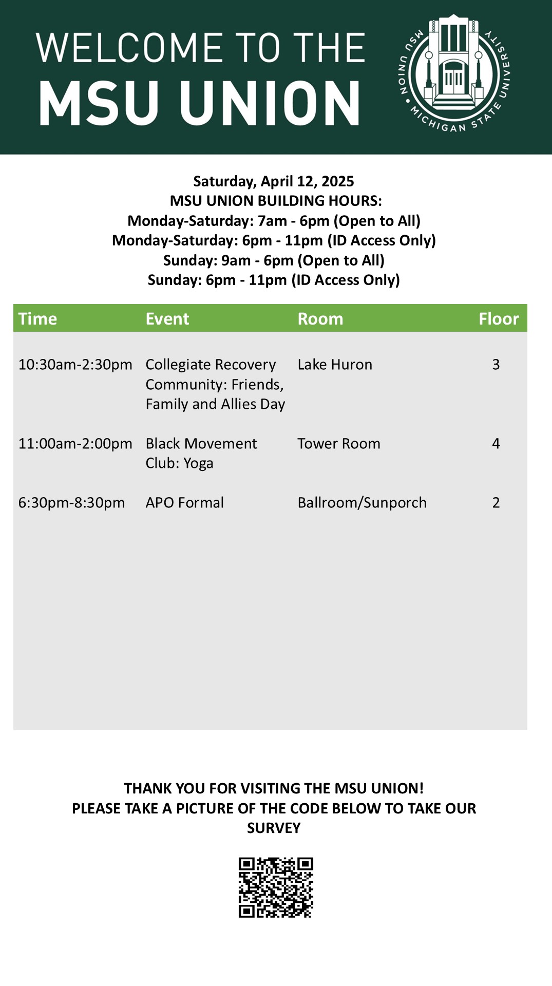 By spitzka, Mon, 04/07/2025 - 09:18 Creator: spitzka Area: MSU Union (Temp Schedule) Type: Academic Title: 4/12/2025 Subheader: Body Copy: Active Dates: Sat, 04/12/2025 - 05:00 - Sat, 04/12/2025 - 23:59 Preview
