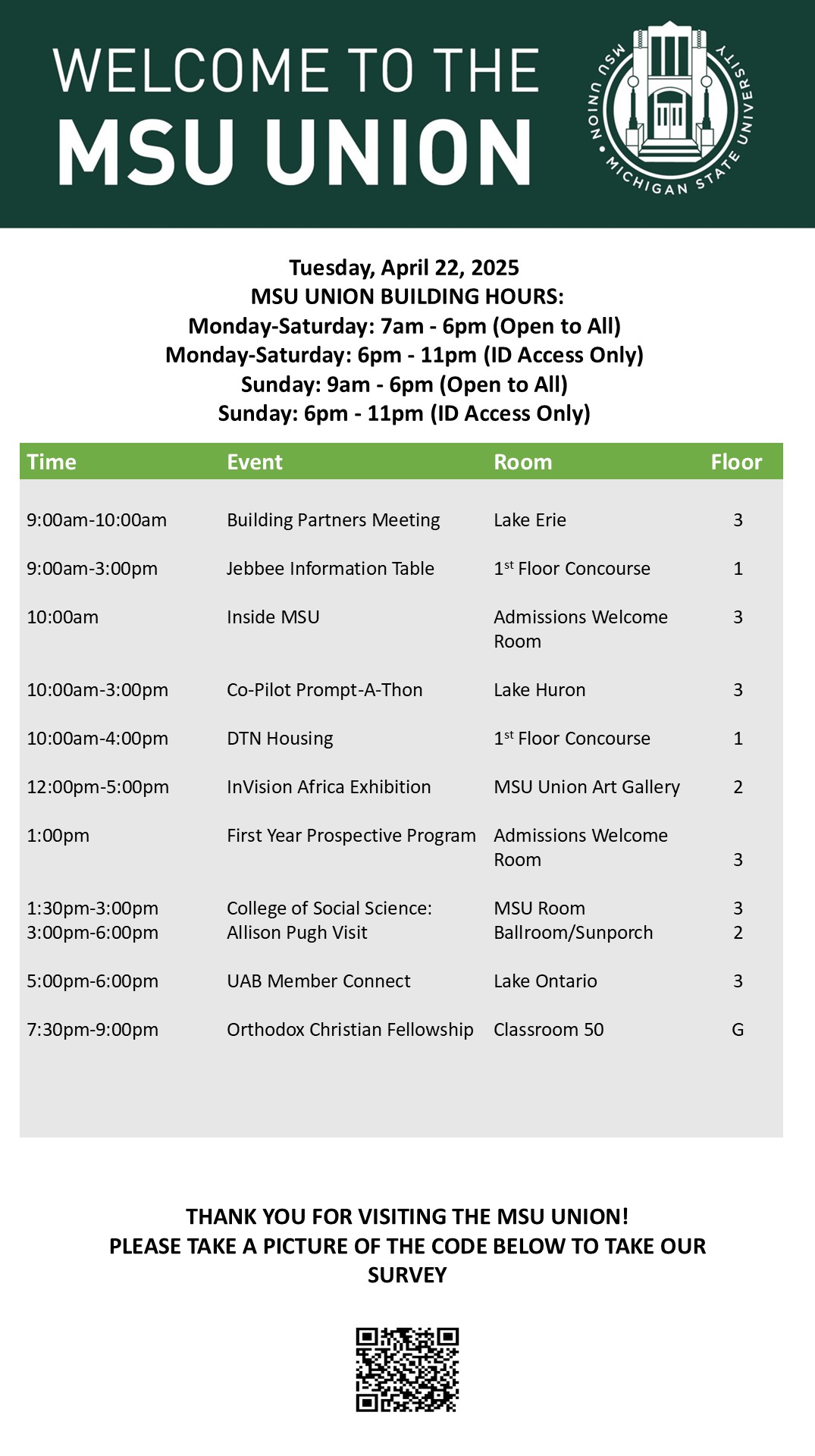 By spitzka, Fri, 04/18/2025 - 11:32 Creator: spitzka Area: MSU Union (Temp Schedule) Type: Academic Title: 4/22/2025 Subheader: Body Copy: Active Dates: Tue, 04/22/2025 - 05:00 - Tue, 04/22/2025 - 23:59 Preview