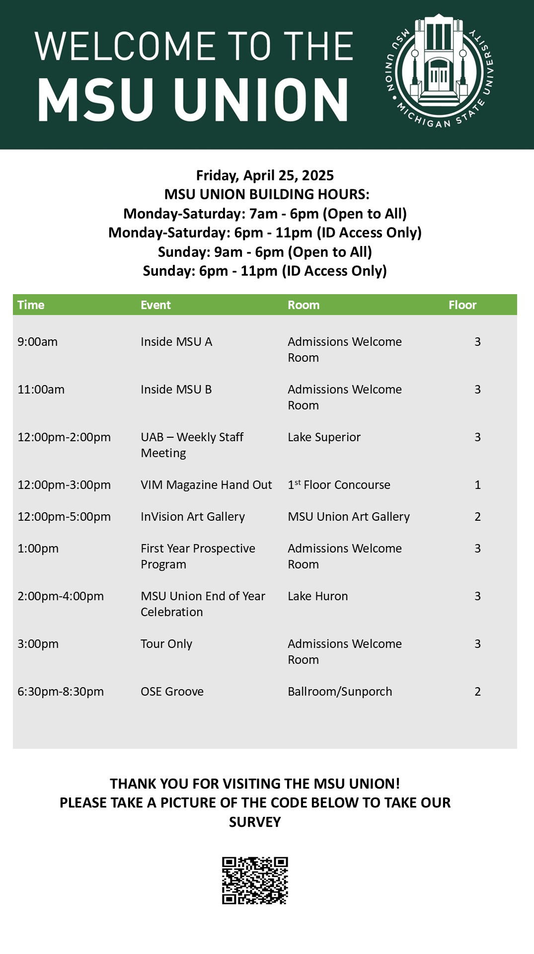 By spitzka, Fri, 04/18/2025 - 11:40 Creator: spitzka Area: MSU Union (Temp Schedule) Type: Academic Title: 4/25/2025 Subheader: Body Copy: Active Dates: Fri, 04/25/2025 - 05:00 - Fri, 04/25/2025 - 23:59 Preview