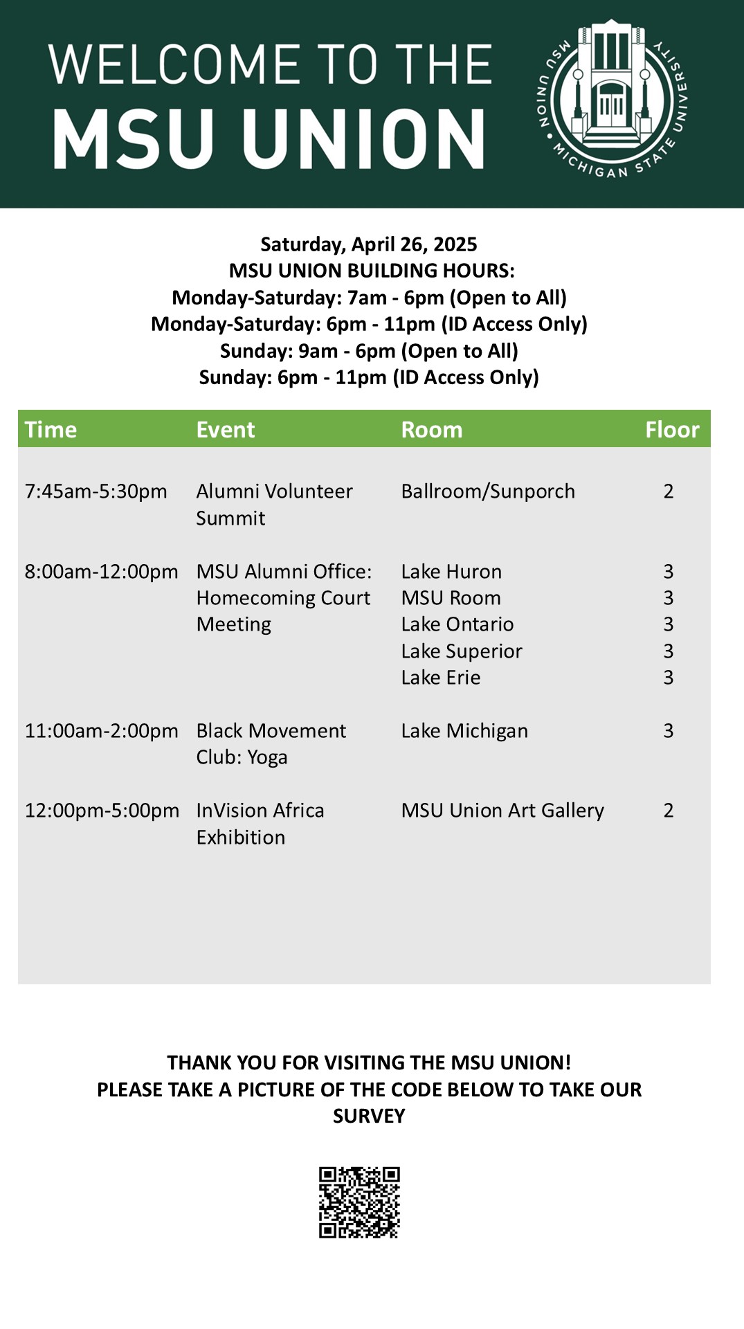By spitzka, Fri, 04/18/2025 - 11:41 Creator: spitzka Area: MSU Union (Temp Schedule) Type: Academic Title: 4/26/2025 Subheader: Body Copy: Active Dates: Sat, 04/26/2025 - 05:00 - Sat, 04/26/2025 - 23:59 Preview