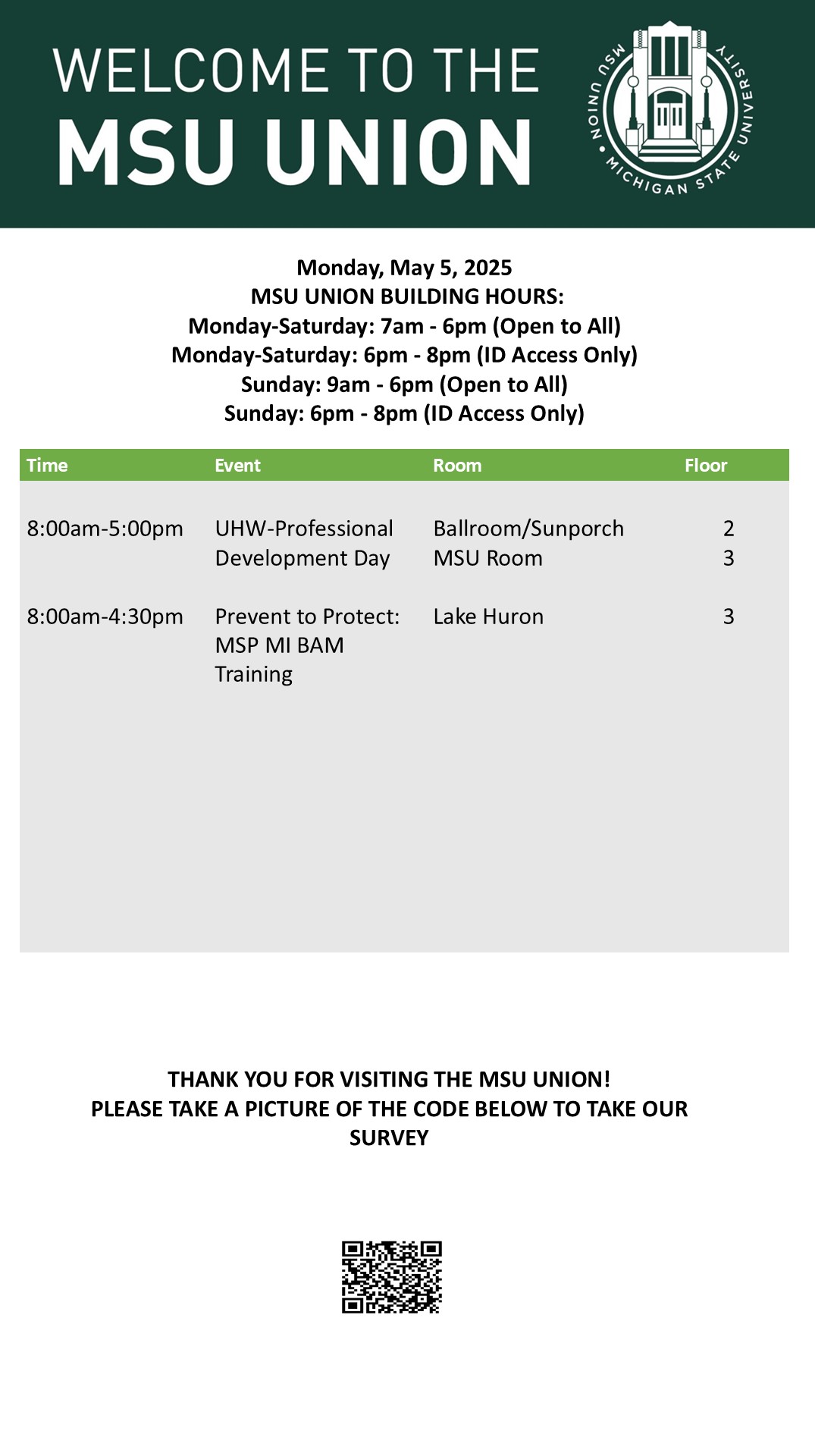 By spitzka, Fri, 05/02/2025 - 14:20 Creator: spitzka Area: MSU Union (Temp Schedule) Type: Academic Title: 5/5/25 Subheader: Body Copy: Active Dates: Mon, 05/05/2025 - 05:00 - Mon, 05/05/2025 - 23:59 Preview