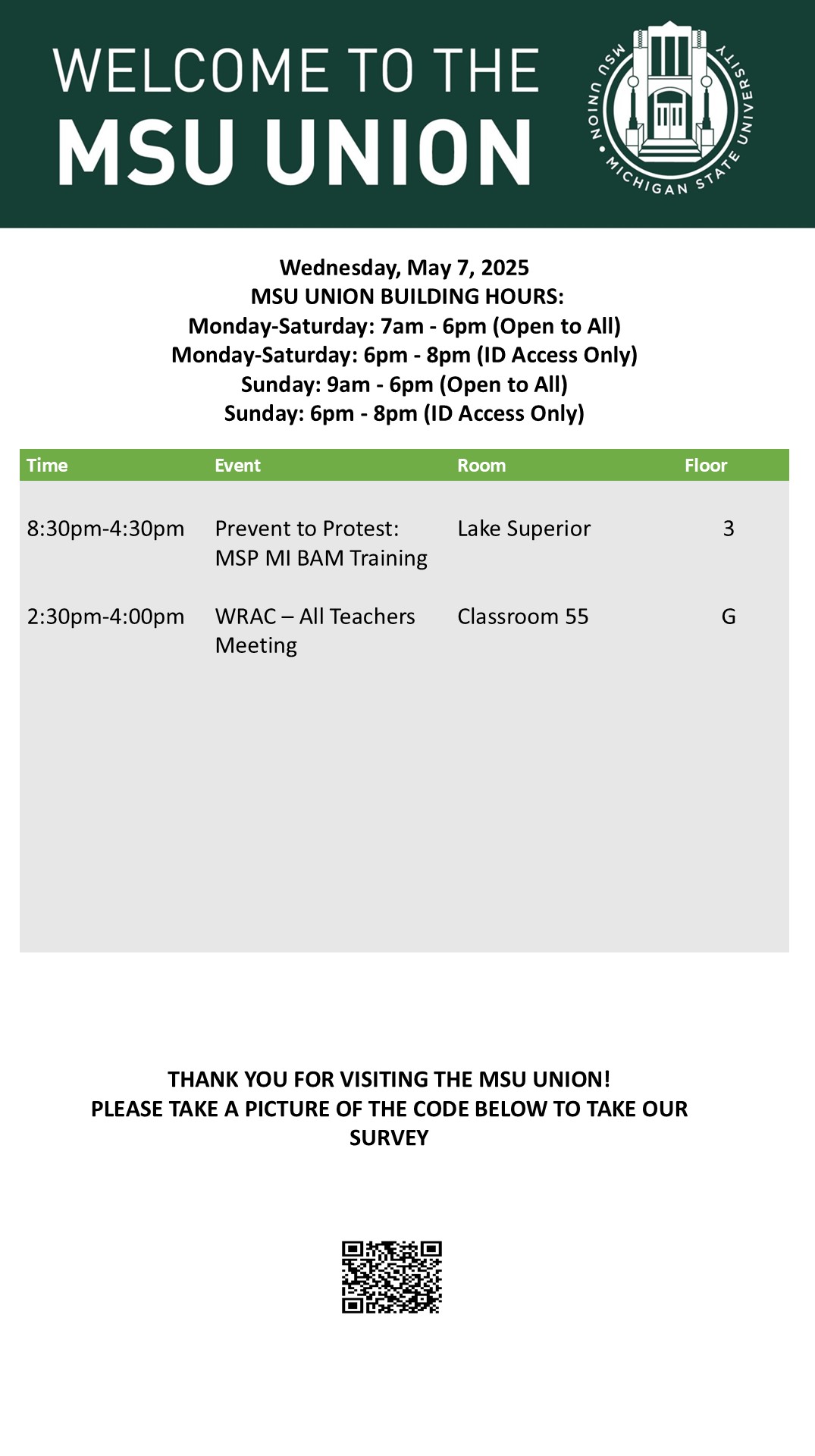 By spitzka, Fri, 05/02/2025 - 14:30 Creator: spitzka Area: MSU Union (Temp Schedule) Type: Academic Title: 5/7/2025 Subheader: Body Copy: Active Dates: Wed, 05/07/2025 - 05:00 - Wed, 05/07/2025 - 23:59 Preview