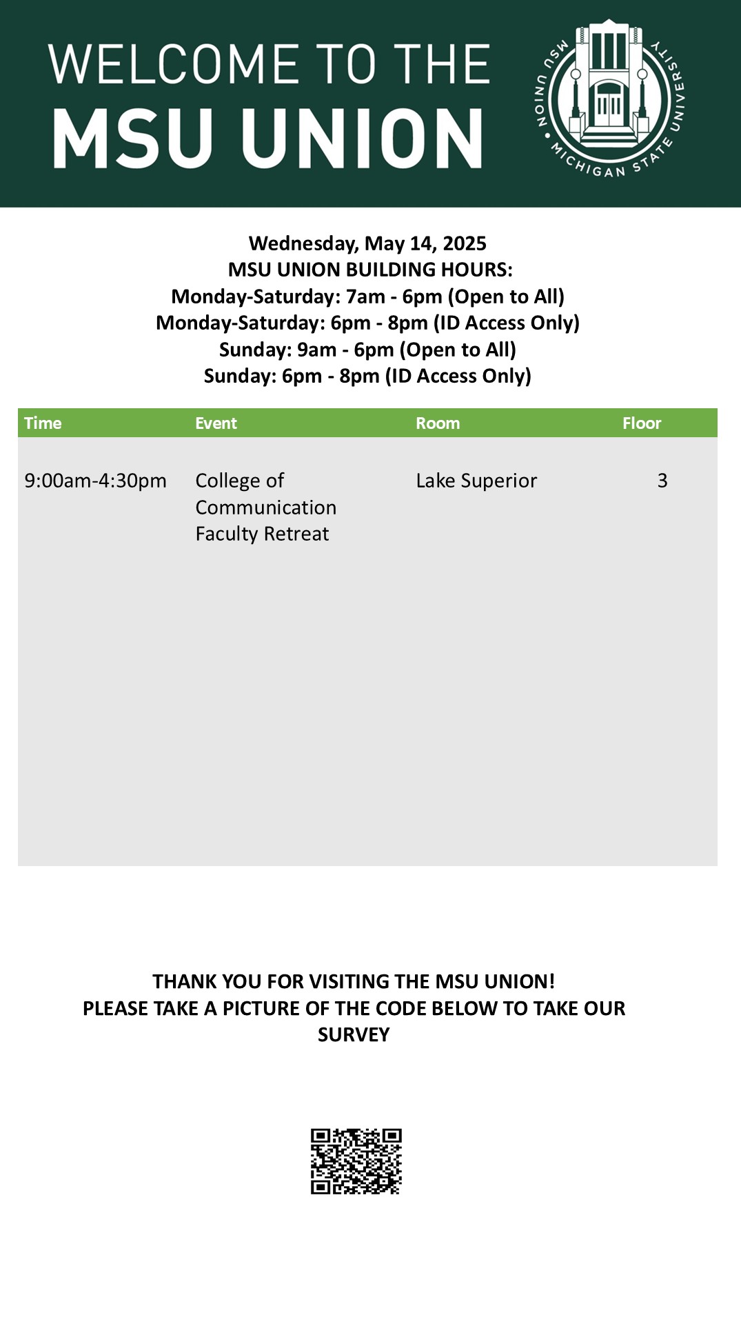 By spitzka, Thu, 05/08/2025 - 09:42 Creator: spitzka Area: MSU Union (Temp Schedule) Type: Academic Title: 5/14/2025 Subheader: Body Copy: Active Dates: Wed, 05/14/2025 - 05:00 - Wed, 05/14/2025 - 23:59 Preview