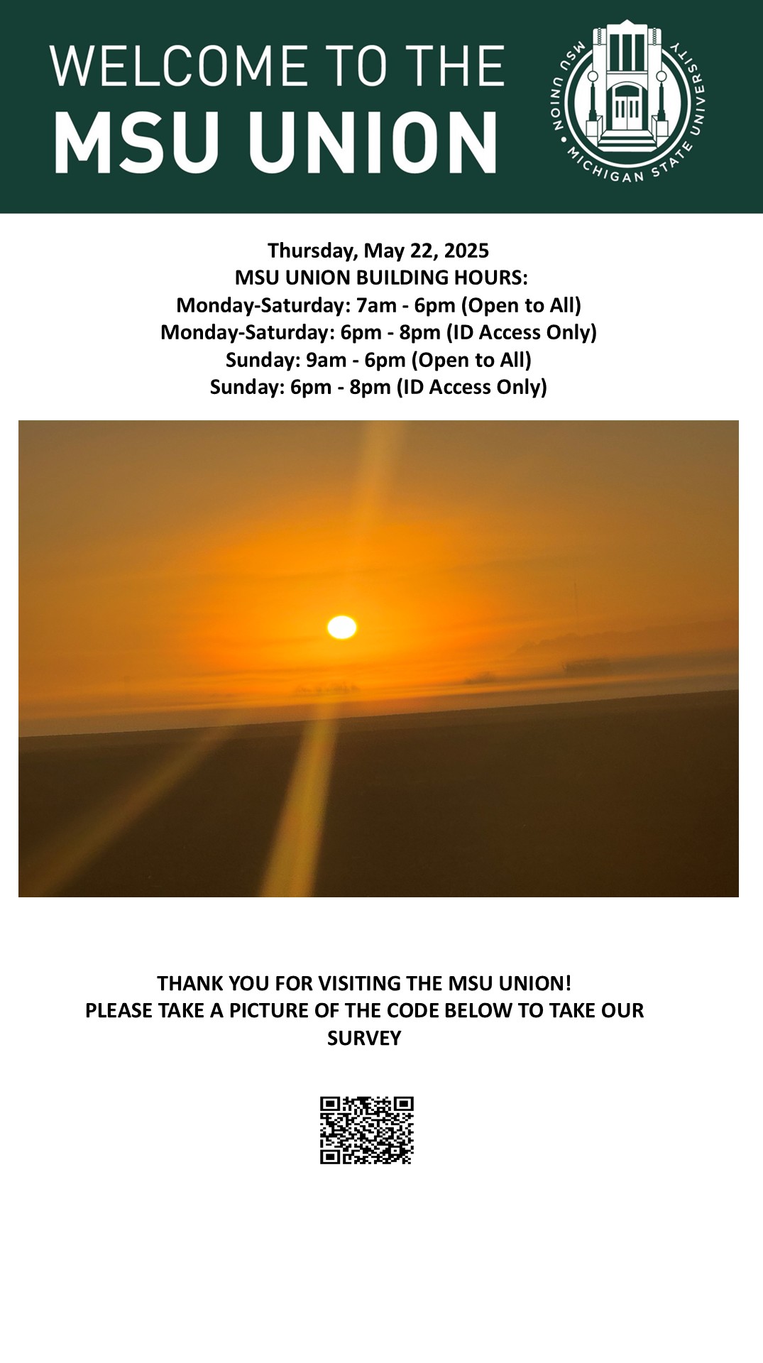 By spitzka, Thu, 05/22/2025 - 08:49 Creator: spitzka Area: MSU Union (Temp Schedule) Type: Academic Title: 5/22/2025 Subheader: Body Copy: Active Dates: Thu, 05/22/2025 - 07:48 - Thu, 05/22/2025 - 23:59 Preview