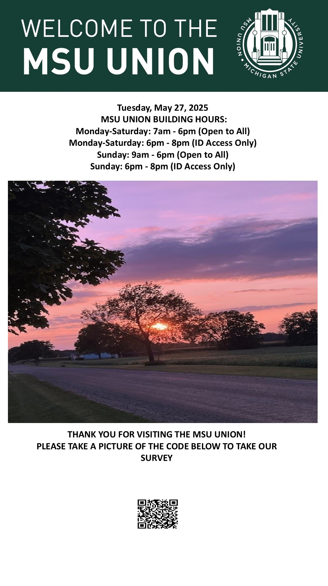 By spitzka, Tue, 05/27/2025 - 07:45 Creator: spitzka Area: MSU Union (Temp Schedule) Type: Academic Title: 5/27/2025 Subheader: Body Copy: Active Dates: Tue, 05/27/2025 - 07:00 - Tue, 05/27/2025 - 23:59 Preview