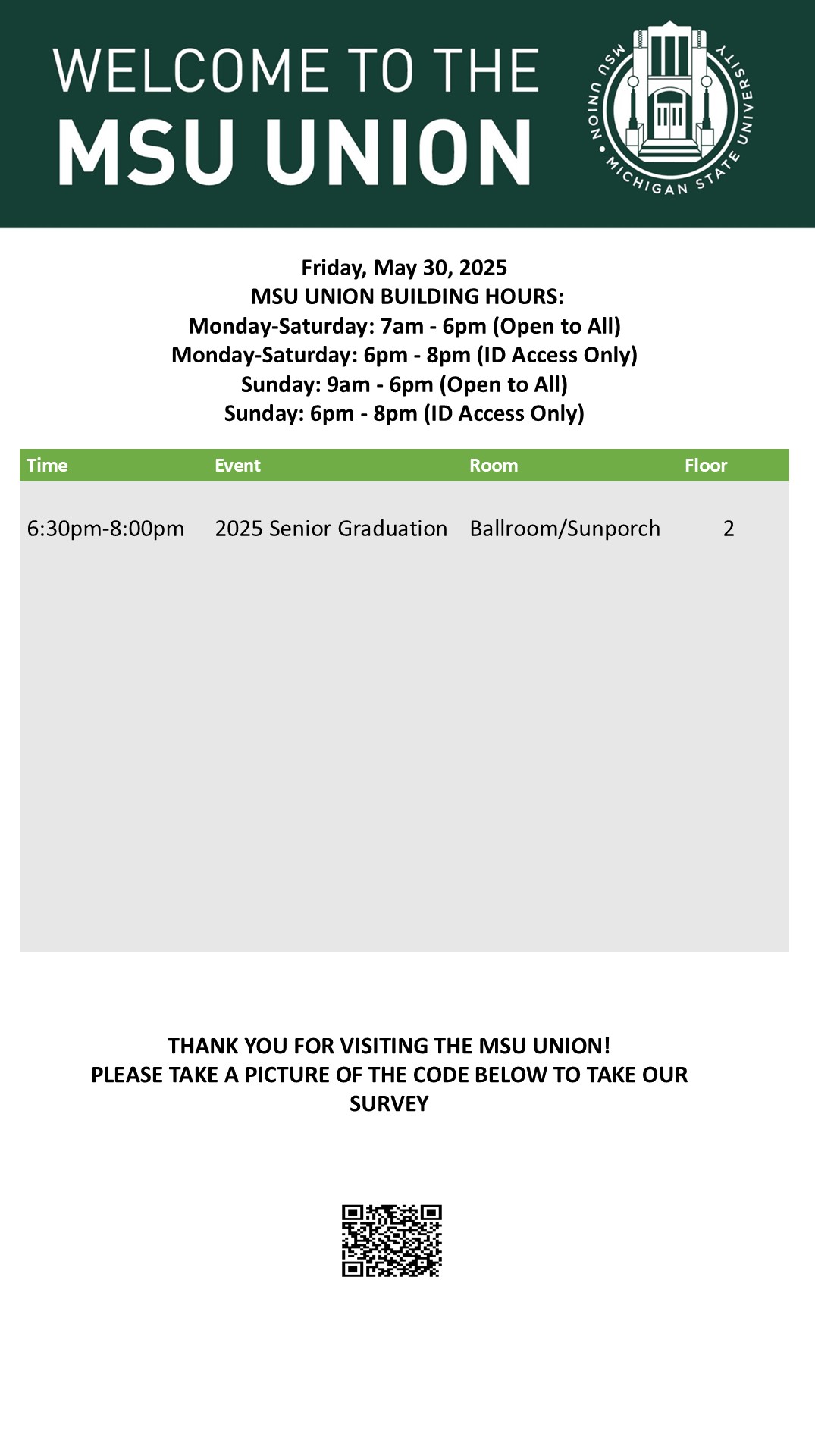 By spitzka, Tue, 05/27/2025 - 08:08 Creator: spitzka Area: MSU Union (Temp Schedule) Type: Academic Title: 5/30/2025 Subheader: Body Copy: Active Dates: Fri, 05/30/2025 - 05:00 - Fri, 05/30/2025 - 23:59 Preview