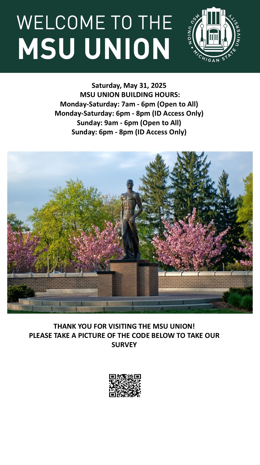 By spitzka, Tue, 05/27/2025 - 08:11 Creator: spitzka Area: MSU Union (Temp Schedule) Type: Academic Title: 5/31/2025 Subheader: Body Copy: Active Dates: Sat, 05/31/2025 - 05:00 - Sat, 05/31/2025 - 23:59 Preview