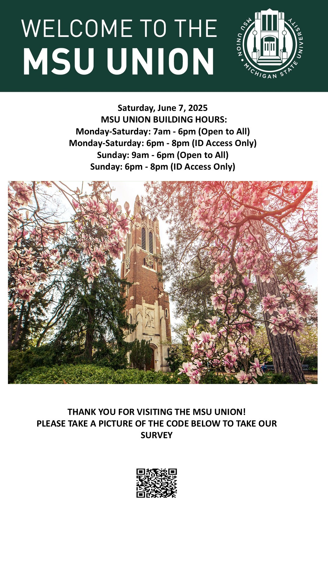 By spitzka, Sun, 06/01/2025 - 09:12 Creator: spitzka Area: MSU Union (Temp Schedule) Type: Academic Title: 6/7/2025 Subheader: Body Copy: Active Dates: Sat, 06/07/2025 - 05:00 - Sat, 06/07/2025 - 23:59 Preview
