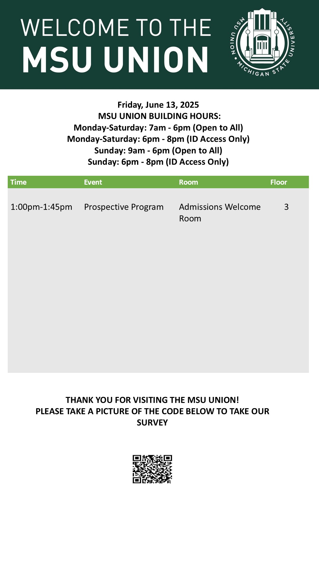 By spitzka, Fri, 06/06/2025 - 12:27 Creator: spitzka Area: MSU Union (Temp Schedule) Type: Academic Title: 6/13/2025 Subheader: Body Copy: Active Dates: Fri, 06/13/2025 - 05:00 - Fri, 06/13/2025 - 23:59 Preview