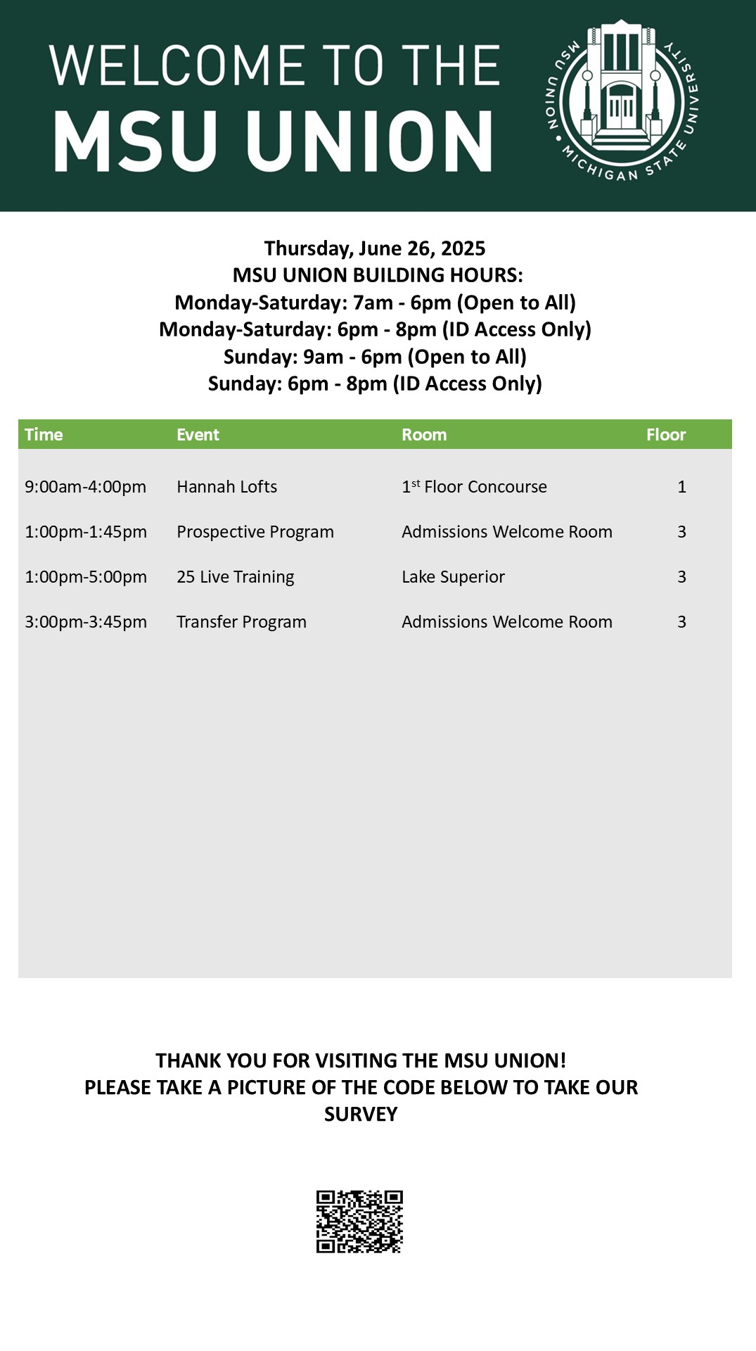By spitzka, Thu, 06/19/2025 - 10:52 Creator: spitzka Area: MSU Union (Temp Schedule) Type: Academic Title: 6/26/25 Subheader: Body Copy: Active Dates: Thu, 06/26/2025 - 05:00 - Thu, 06/26/2025 - 23:59 Preview