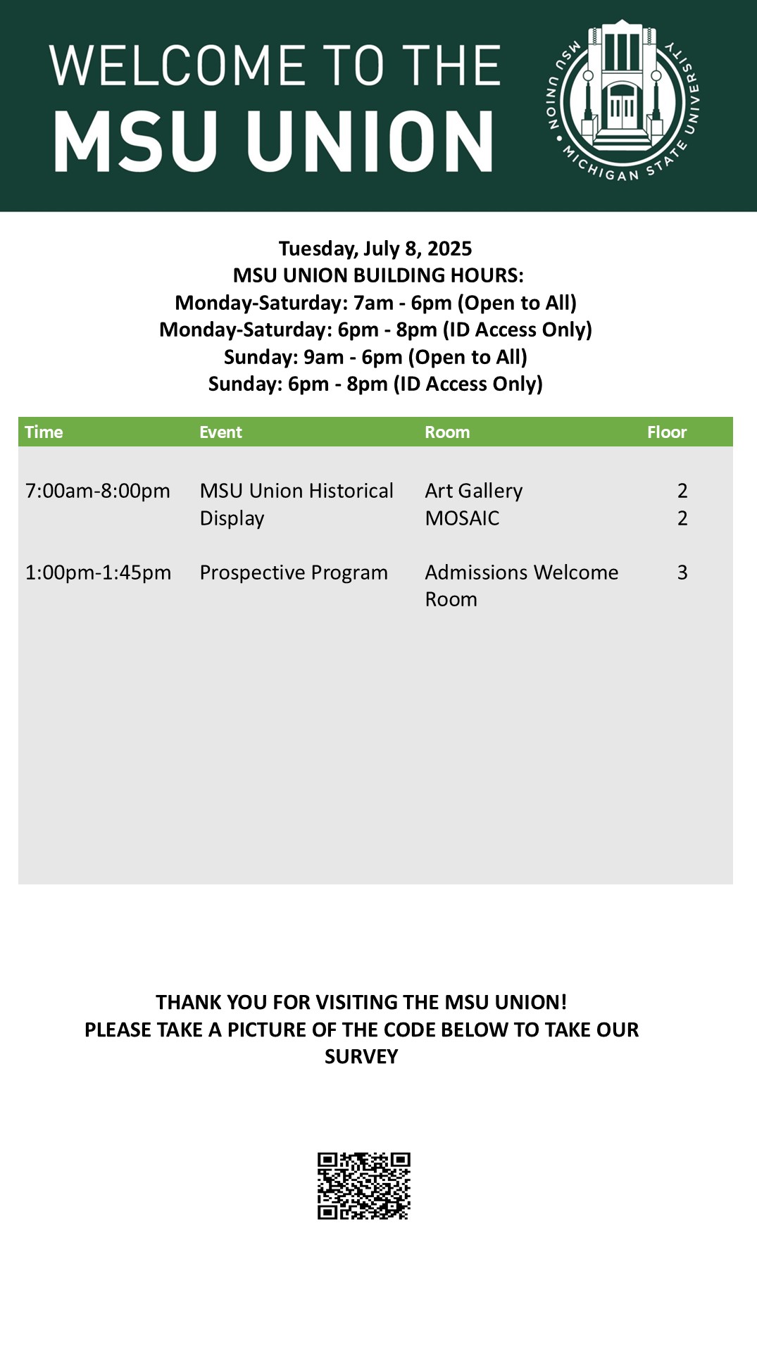 By spitzka, Wed, 07/02/2025 - 14:09 Creator: spitzka Area: MSU Union (Temp Schedule) Type: Academic Title: 7.8.25 Subheader: Body Copy: Active Dates: Tue, 07/08/2025 - 05:00 - Tue, 07/08/2025 - 23:59 Preview