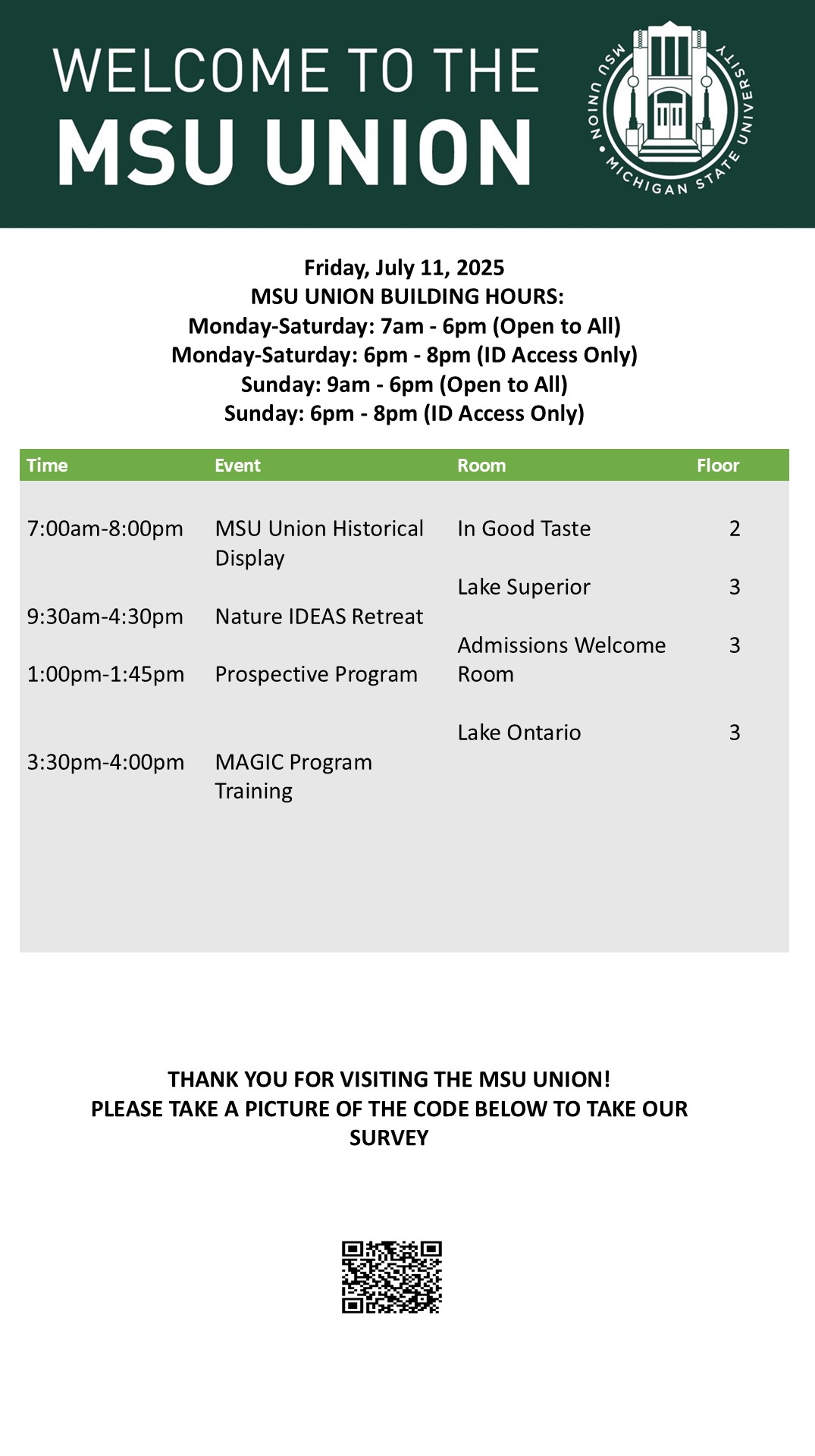 By spitzka, Wed, 07/02/2025 - 14:10 Creator: spitzka Area: MSU Union (Temp Schedule) Type: Academic Title: 7.11.25 Subheader: Body Copy: Active Dates: Fri, 07/11/2025 - 05:00 - Fri, 07/11/2025 - 23:59 Preview
