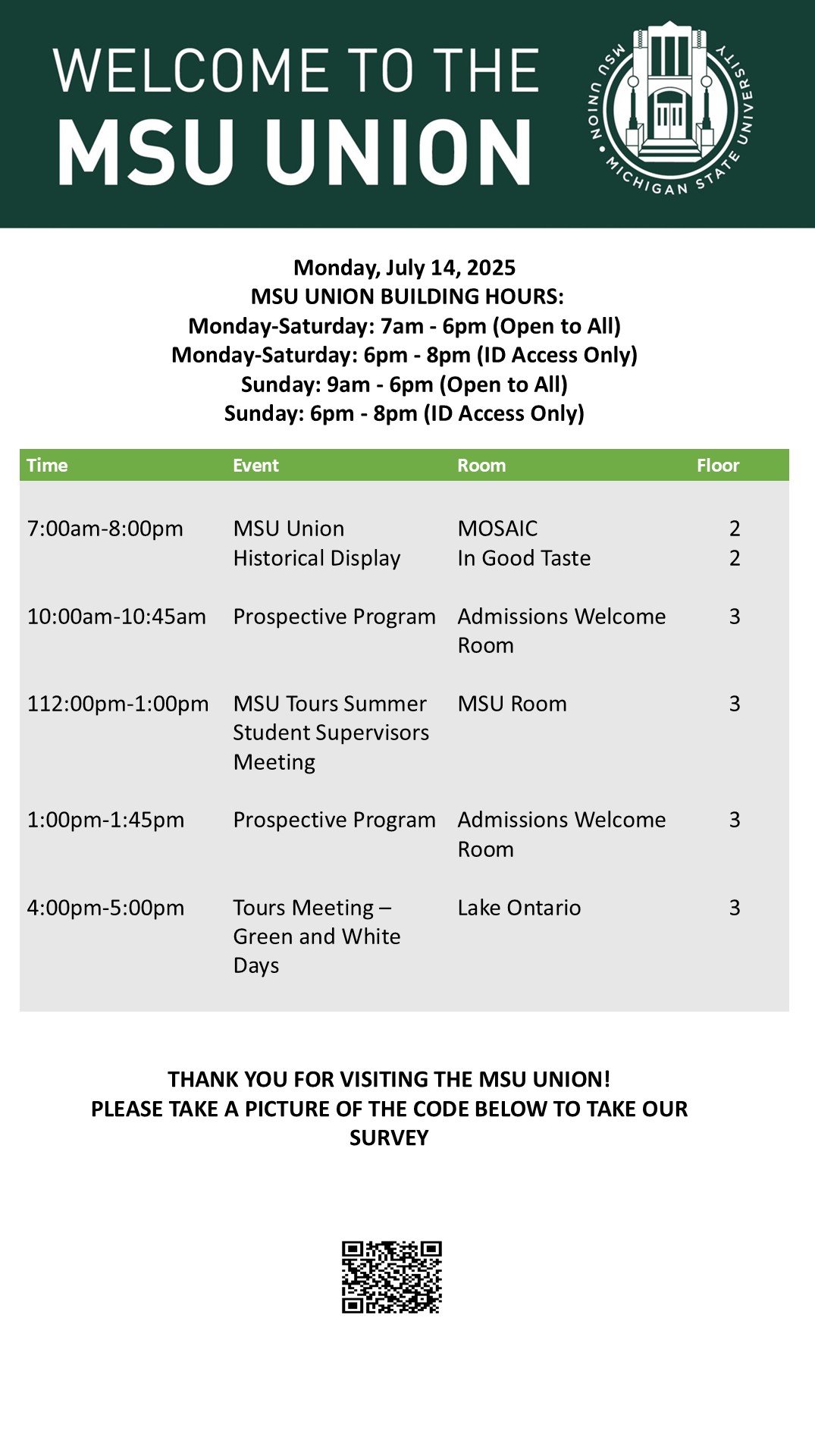 By spitzka, Mon, 07/14/2025 - 08:47 Creator: spitzka Area: MSU Union (Temp Schedule) Type: Academic Title: 7/14/25 Subheader: Body Copy: Active Dates: Mon, 07/14/2025 - 07:47 - Mon, 07/14/2025 - 23:59 Preview