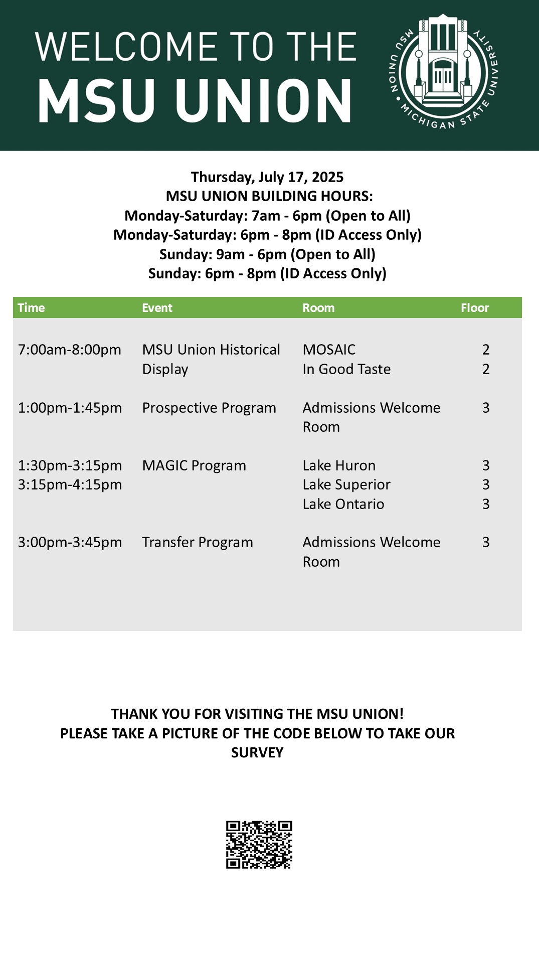 By spitzka, Mon, 07/14/2025 - 08:57 Creator: spitzka Area: MSU Union (Temp Schedule) Type: Academic Title: 7/17/2025 Subheader: Body Copy: Active Dates: Thu, 07/17/2025 - 05:00 - Thu, 07/17/2025 - 23:59 Preview