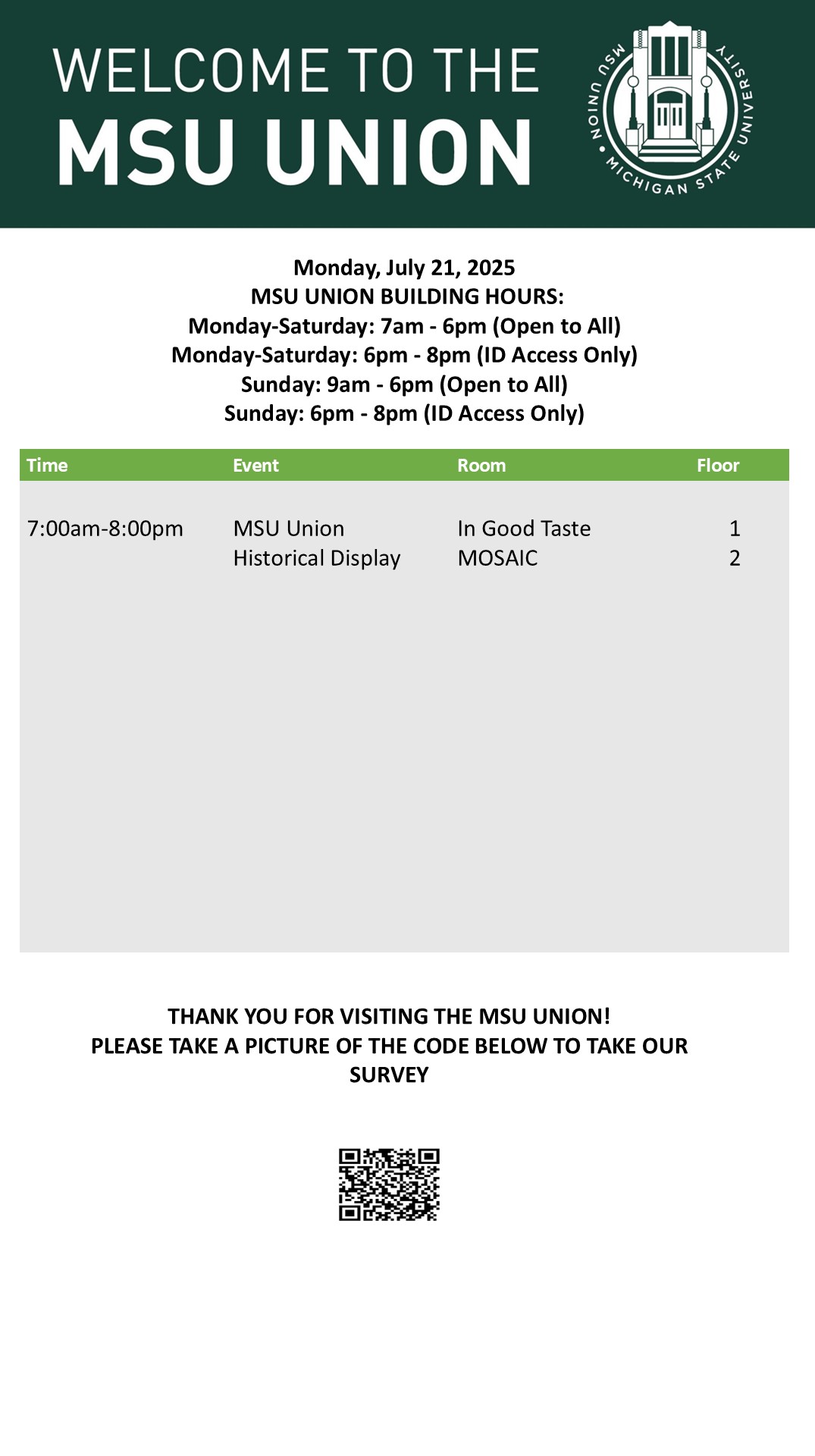 By spitzka, Sat, 07/19/2025 - 10:49 Creator: spitzka Area: MSU Union (Temp Schedule) Type: Academic Title: 7/21/2025 Subheader: Body Copy: Active Dates: Mon, 07/21/2025 - 05:00 - Mon, 07/21/2025 - 23:59 Preview