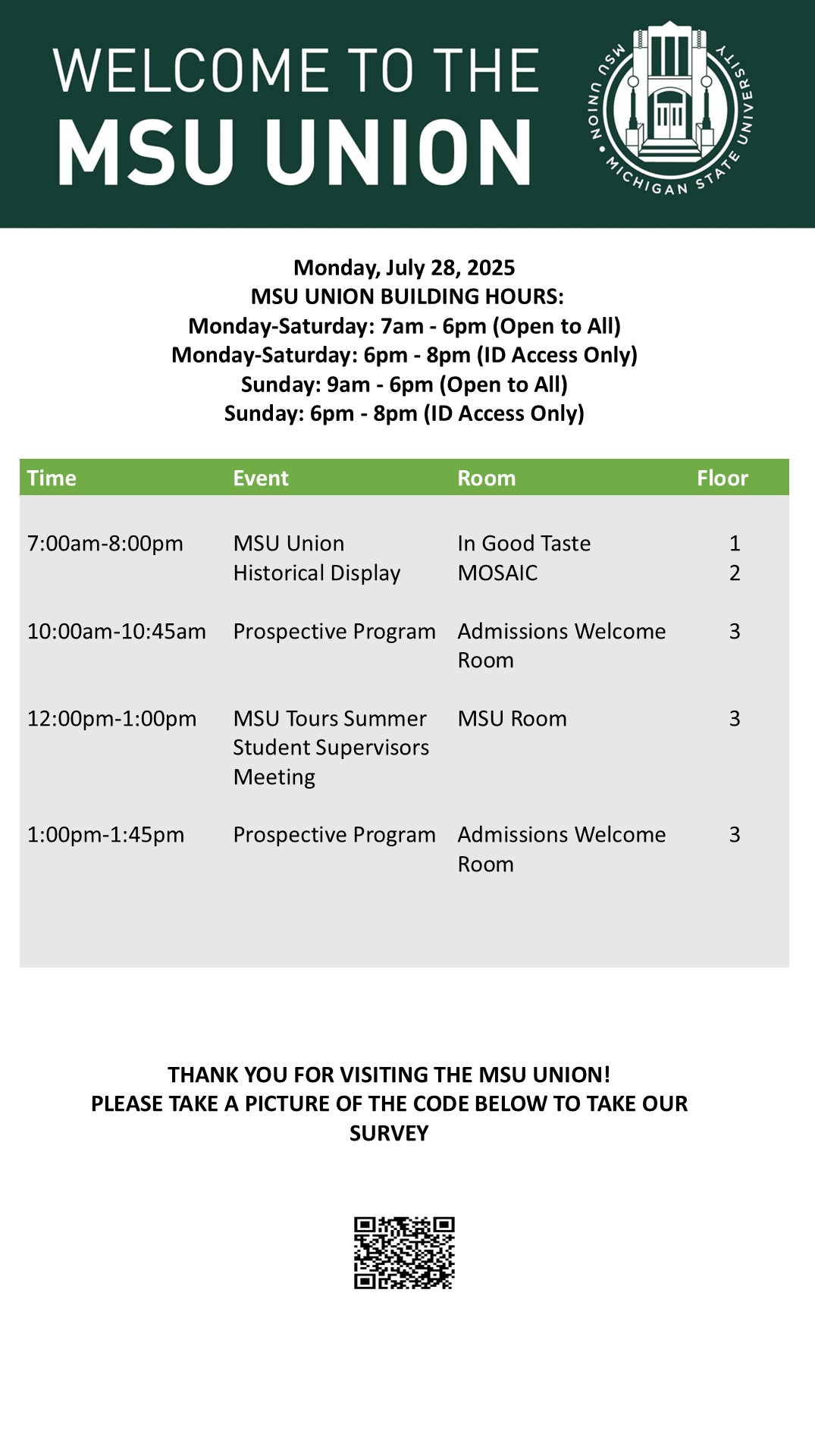By spitzka, Wed, 07/23/2025 - 11:31 Creator: spitzka Area: MSU Union (Temp Schedule) Type: Academic Title: 7/28/2025 Subheader: Body Copy: Active Dates: Mon, 07/28/2025 - 05:00 - Mon, 07/28/2025 - 23:59 Preview