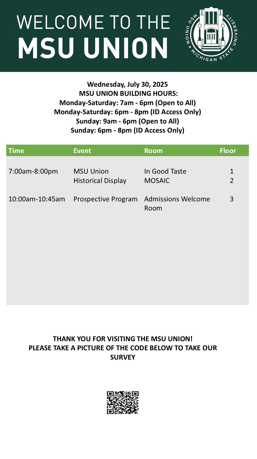 By spitzka, Wed, 07/23/2025 - 11:32 Creator: spitzka Area: MSU Union (Temp Schedule) Type: Academic Title: 7/30/2025 Subheader: Body Copy: Active Dates: Wed, 07/30/2025 - 05:00 - Wed, 07/30/2025 - 23:59 Preview