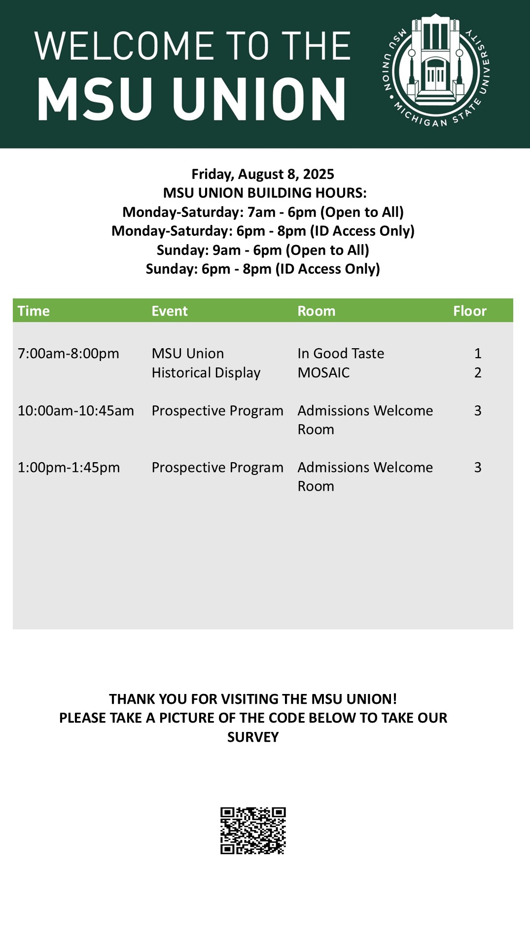 By cosme, Mon, 08/04/2025 - 13:17 Creator: cosme Area: MSU Union (Temp Schedule) Type: Academic Title: 8/8/25 Subheader: Body Copy: Active Dates: Fri, 08/08/2025 - 03:59 - Fri, 08/08/2025 - 23:59 Preview