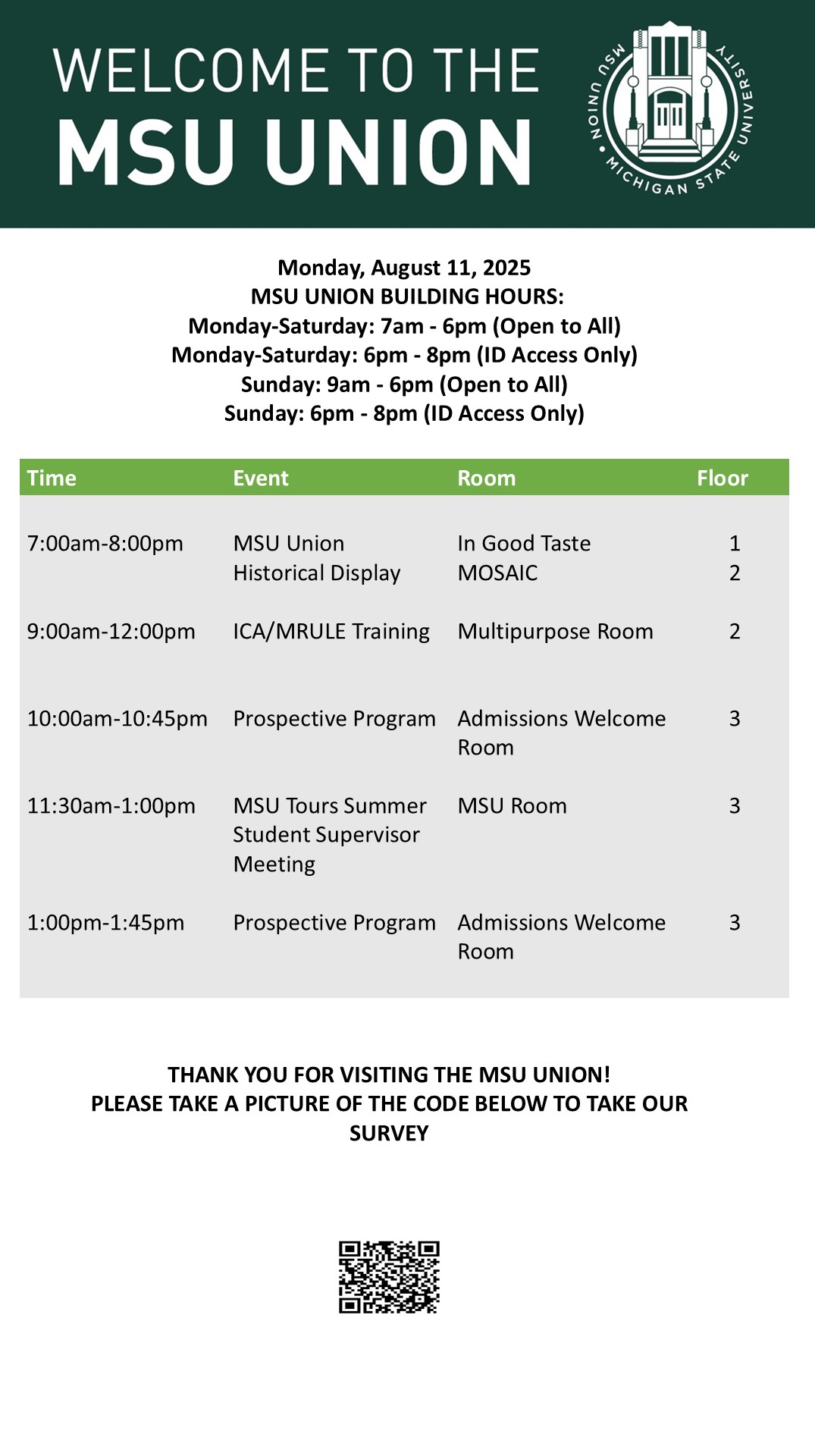 By cosme, Thu, 08/07/2025 - 15:13 Creator: cosme Area: MSU Union (Temp Schedule) Type: Academic Title: 8/11/25 Subheader: Body Copy: Active Dates: Mon, 08/11/2025 - 07:15 - Mon, 08/11/2025 - 19:00 Preview