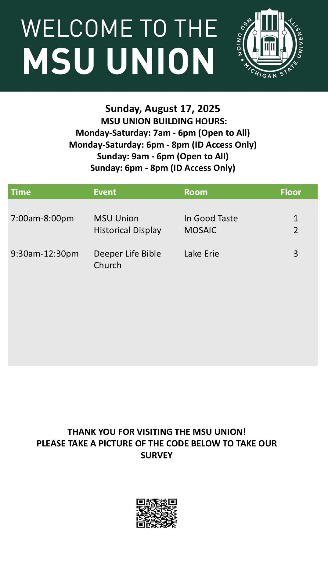 By cosme, Thu, 08/07/2025 - 15:18 Creator: cosme Area: MSU Union (Temp Schedule) Type: Academic Title: 8/17/25 Subheader: Body Copy: Active Dates: Sun, 08/17/2025 - 07:15 - Sun, 08/17/2025 - 19:00 Preview