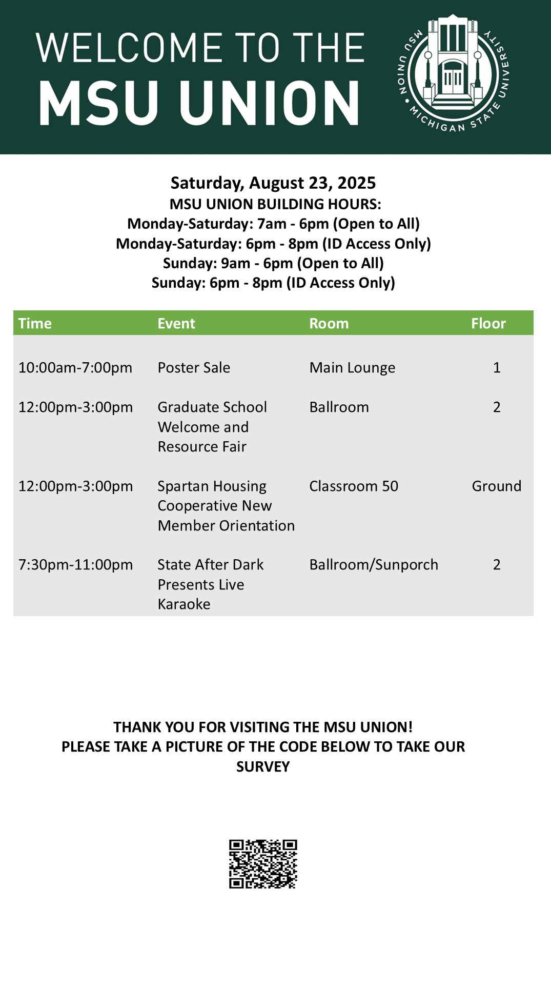 By cosme, Fri, 08/22/2025 - 17:35 Creator: cosme Area: MSU Union (Temp Schedule) Type: Academic Title: 8/23/25 Subheader: Body Copy: Active Dates: Sat, 08/23/2025 - 04:50 - Sat, 08/23/2025 - 23:59 Preview