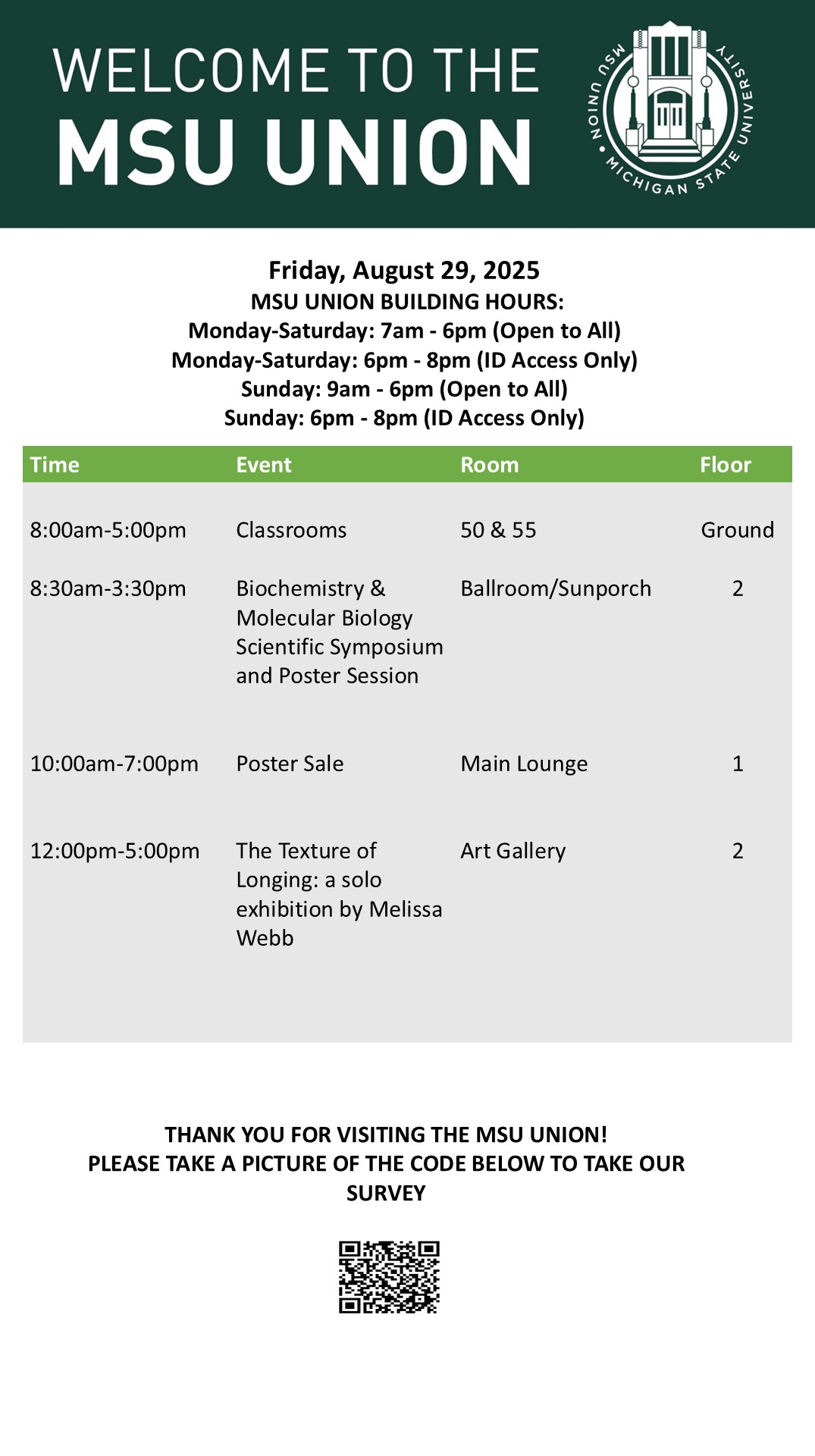 By cosme, Mon, 08/25/2025 - 13:59 Creator: cosme Area: MSU Union (Temp Schedule) Type: Academic Title: 8/29/25 Subheader: Body Copy: Active Dates: Fri, 08/29/2025 - 04:50 - Fri, 08/29/2025 - 23:59 Preview