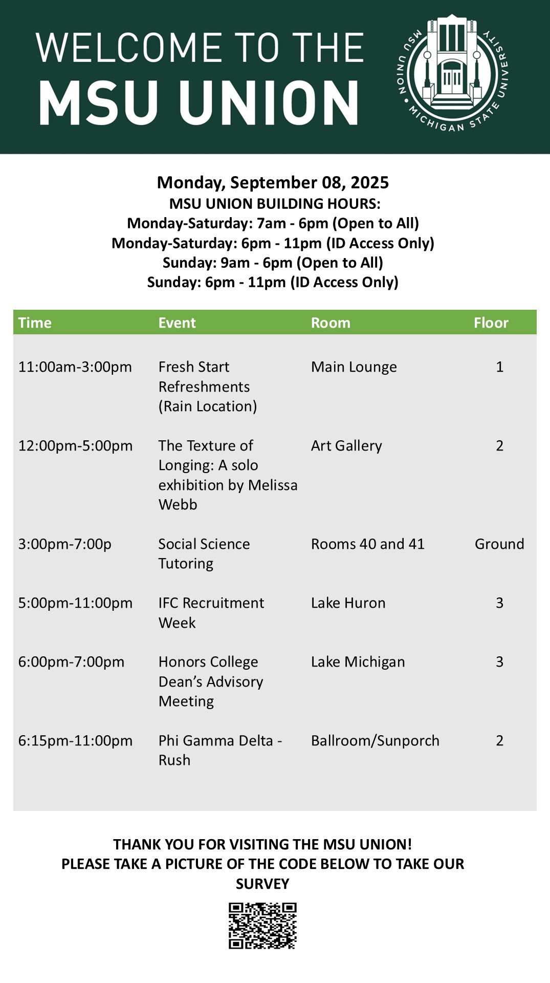 By cosme, Tue, 09/02/2025 - 14:53 Creator: cosme Area: MSU Union (Temp Schedule) Type: Academic Title: 9/08/25 Subheader: Body Copy: Active Dates: Mon, 09/08/2025 - 04:50 - Mon, 09/08/2025 - 23:59 Preview