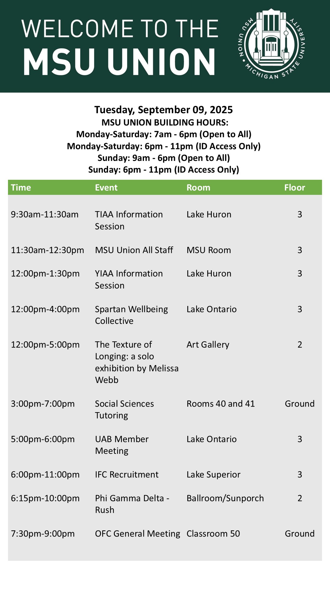 By cosme, Tue, 09/02/2025 - 14:54 Creator: cosme Area: MSU Union (Temp Schedule) Type: Academic Title: 09/09/25 Subheader: Body Copy: Active Dates: Tue, 09/09/2025 - 04:50 - Tue, 09/09/2025 - 23:59 Preview