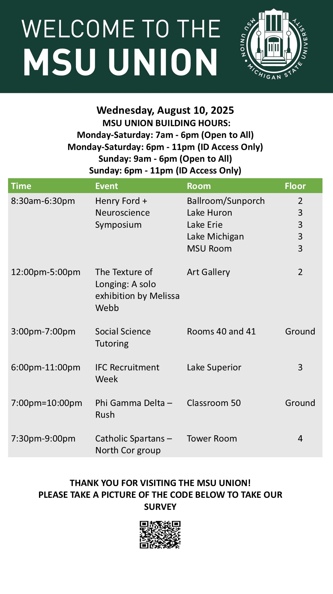 By cosme, Tue, 09/02/2025 - 14:54 Creator: cosme Area: MSU Union (Temp Schedule) Type: Academic Title: 09/10/25 Subheader: Body Copy: Active Dates: Wed, 09/10/2025 - 04:50 - Wed, 09/10/2025 - 23:59 Preview