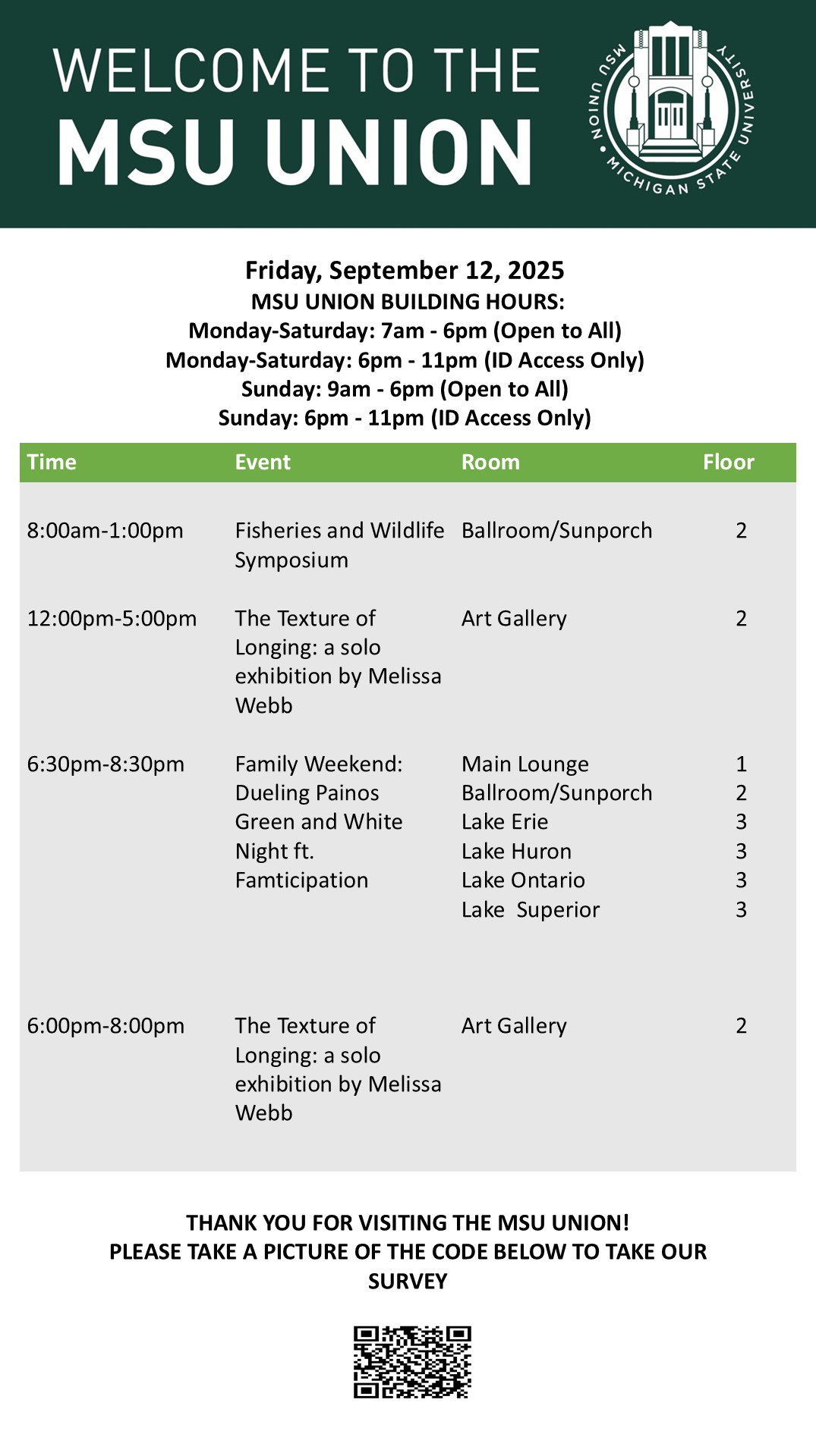 By cosme, Tue, 09/02/2025 - 14:56 Creator: cosme Area: MSU Union (Temp Schedule) Type: Academic Title: 09/12/25 Subheader: Body Copy: Active Dates: Fri, 09/12/2025 - 04:50 - Fri, 09/12/2025 - 23:59 Preview