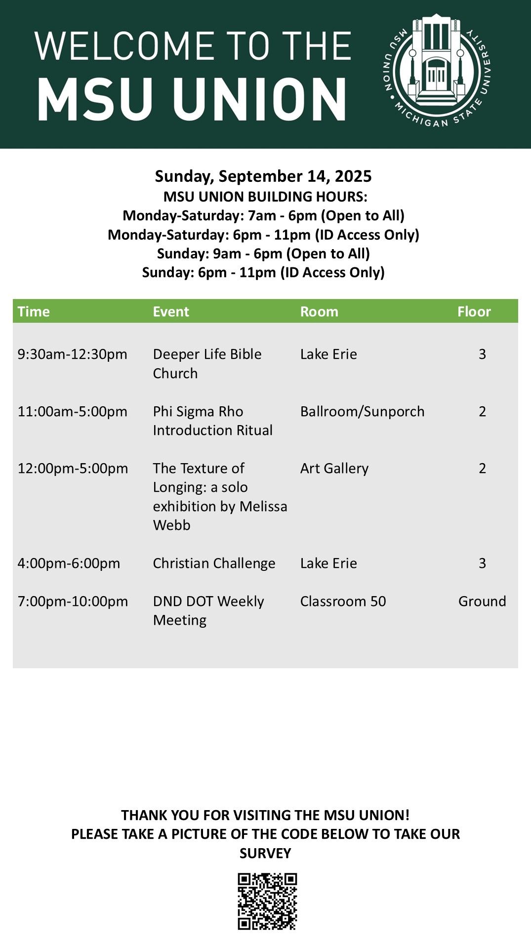 By cosme, Tue, 09/02/2025 - 14:58 Creator: cosme Area: MSU Union (Temp Schedule) Type: Academic Title: 09/14/25 Subheader: Body Copy: Active Dates: Sun, 09/14/2025 - 04:50 - Sun, 09/14/2025 - 23:59 Preview
