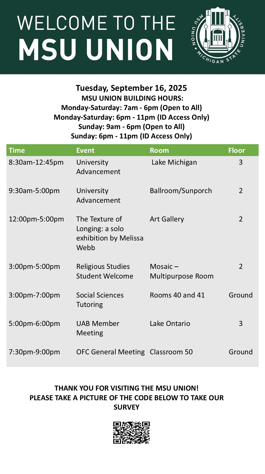 By cosme, Thu, 09/11/2025 - 14:04 Creator: cosme Area: MSU Union (Temp Schedule) Type: Academic Title: 9/16/25 Subheader: Body Copy: Active Dates: Tue, 09/16/2025 - 04:50 - Tue, 09/16/2025 - 23:59 Preview