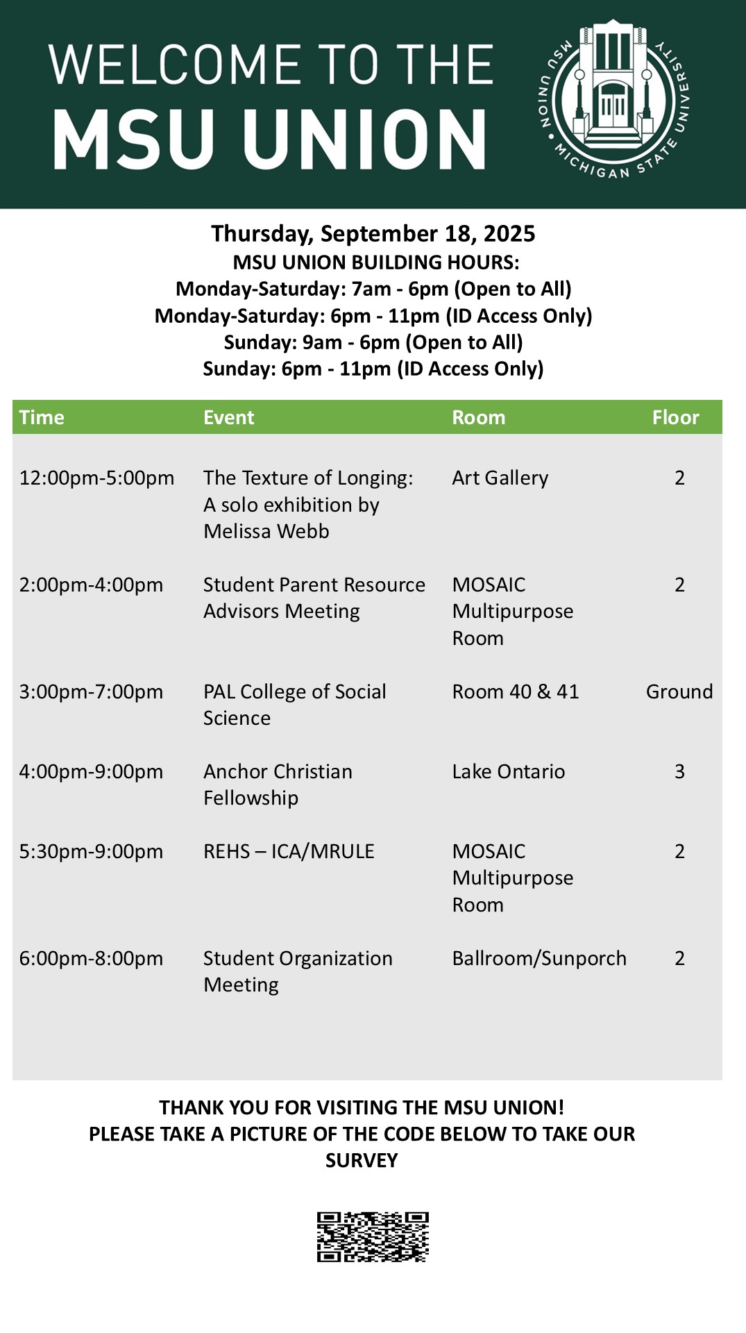 By spitzka, Tue, 09/16/2025 - 07:59 Creator: spitzka Area: MSU Union (Temp Schedule) Type: Academic Title: 9/18/25 Subheader: Body Copy: Active Dates: Thu, 09/18/2025 - 05:00 - Thu, 09/18/2025 - 23:59 Preview