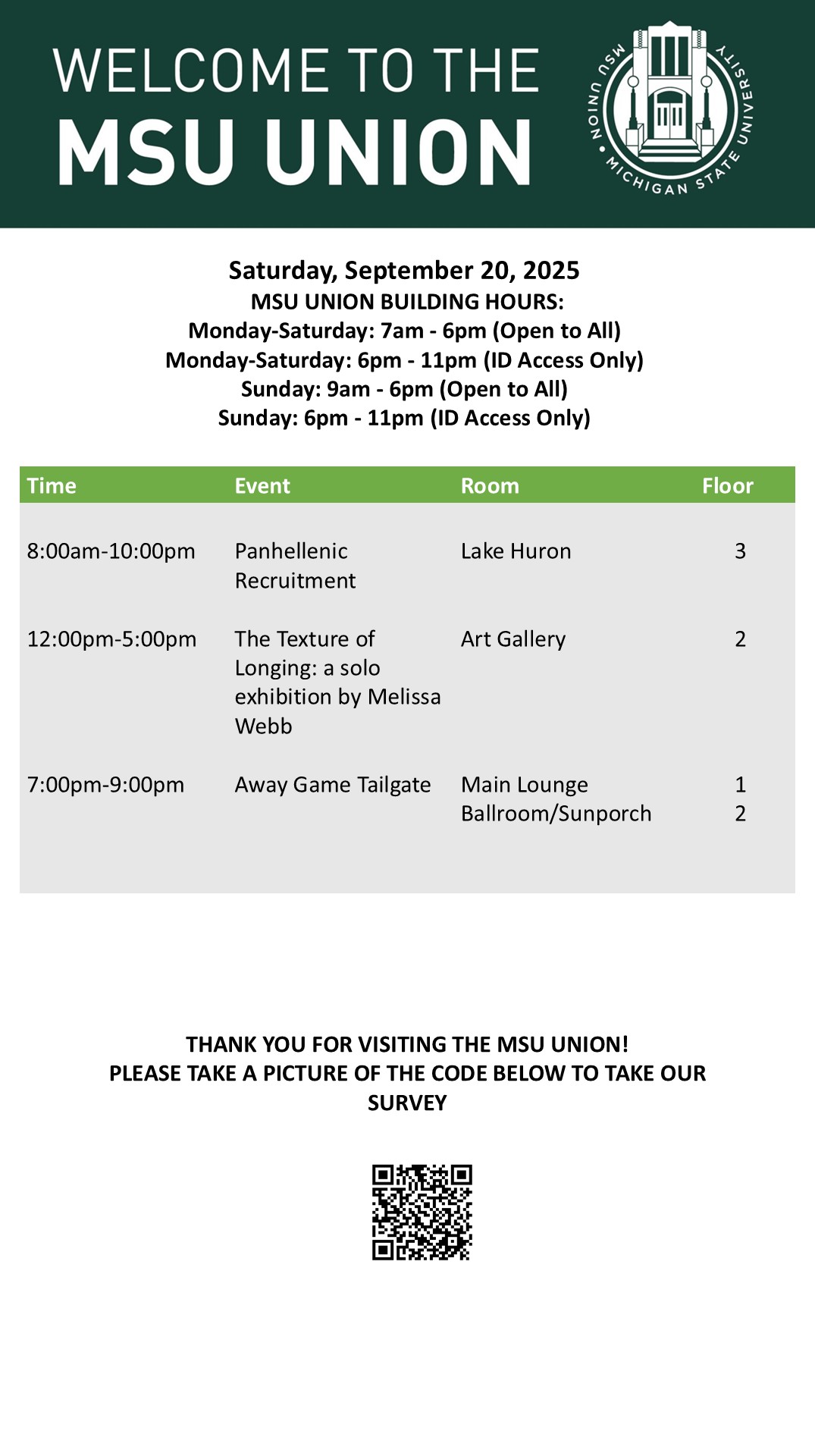 By spitzka, Tue, 09/16/2025 - 08:17 Creator: spitzka Area: MSU Union (Temp Schedule) Type: Academic Title: 9/20/25 Subheader: Body Copy: Active Dates: Sat, 09/20/2025 - 05:00 - Sat, 09/20/2025 - 23:59 Preview