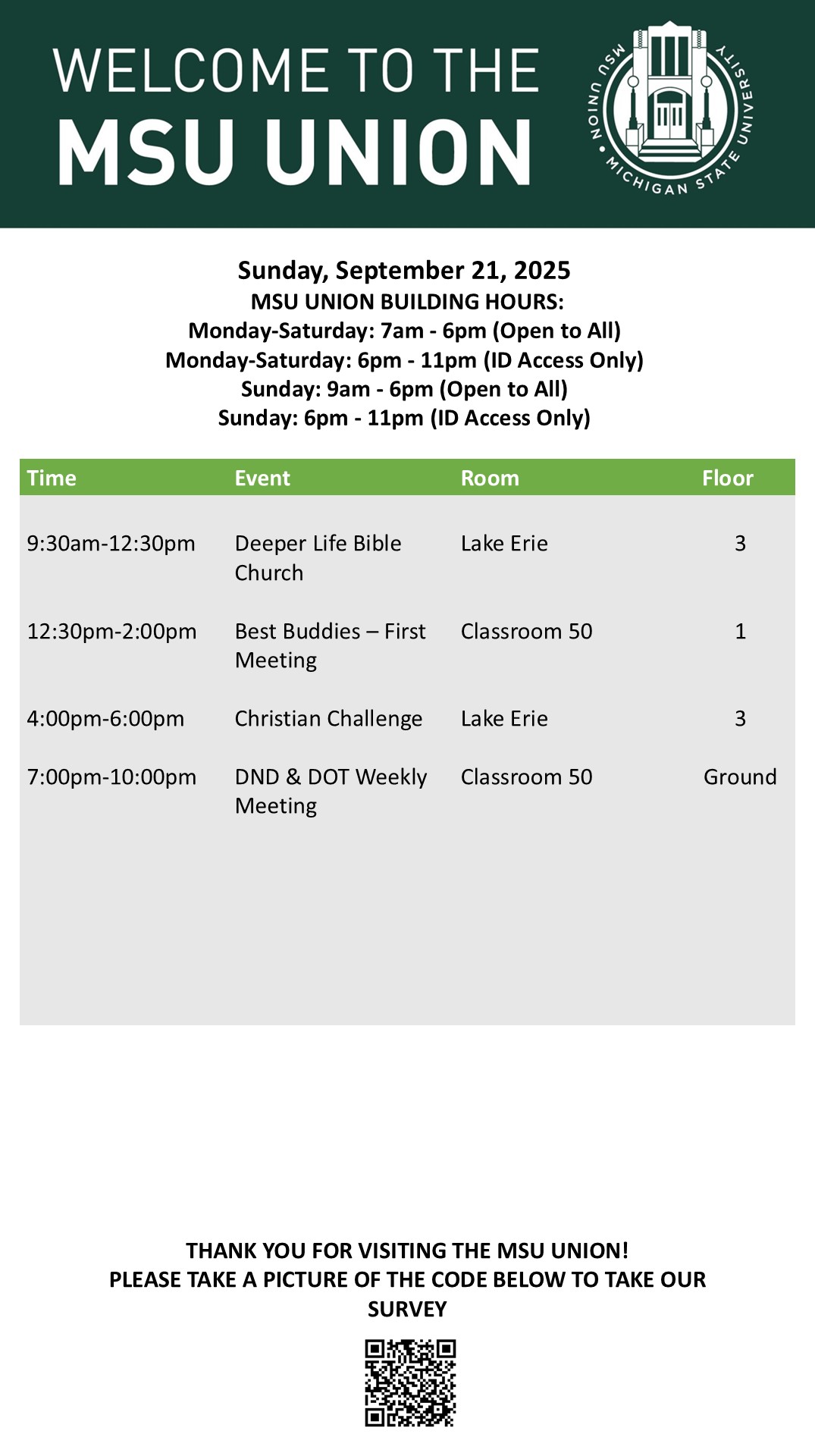 By spitzka, Tue, 09/16/2025 - 08:21 Creator: spitzka Area: MSU Union (Temp Schedule) Type: Academic Title: 9/21/25 Subheader: Body Copy: Active Dates: Sun, 09/21/2025 - 05:00 - Sun, 09/21/2025 - 23:59 Preview