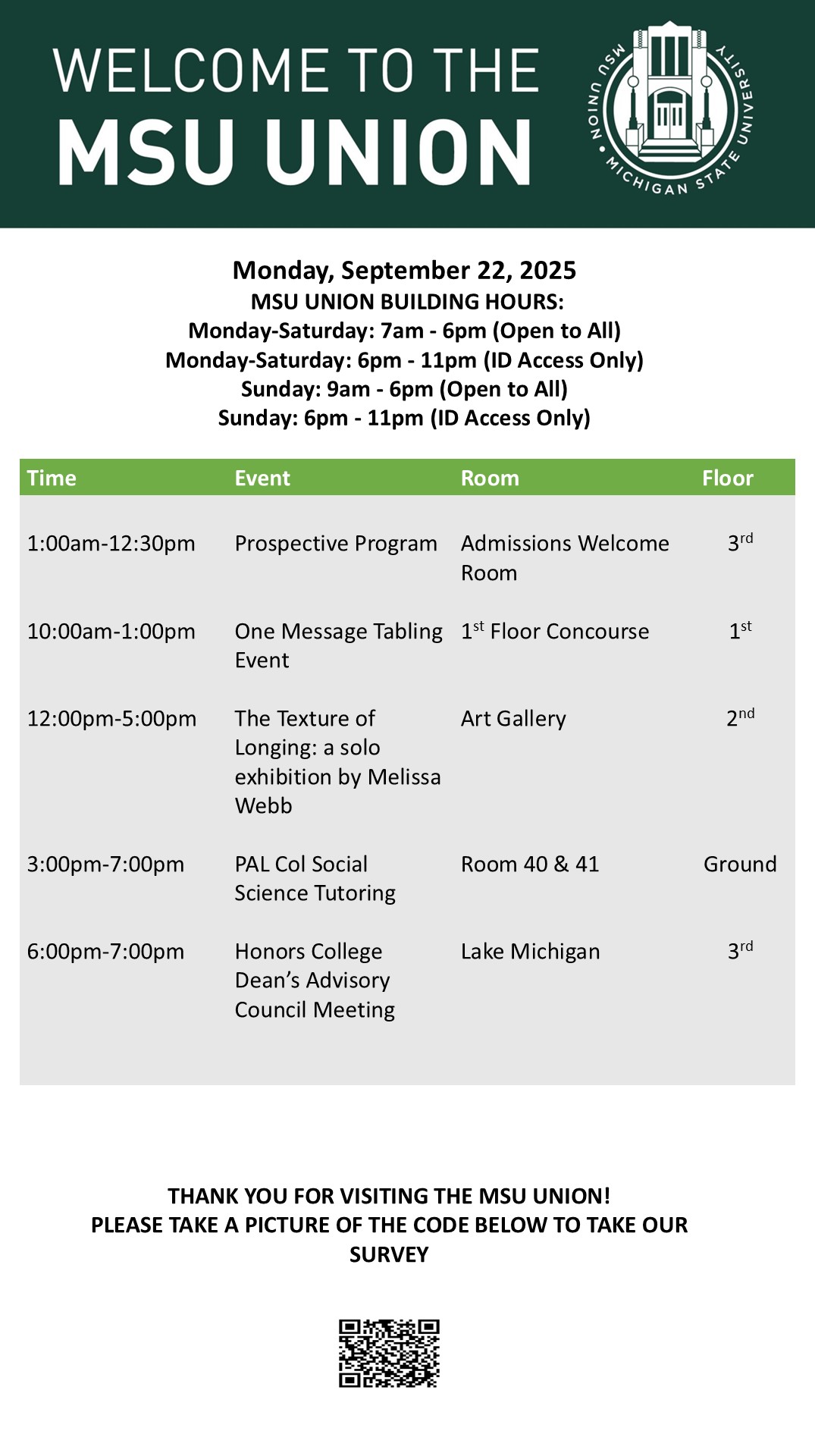 By spitzka, Wed, 09/17/2025 - 14:38 Creator: spitzka Area: MSU Union (Temp Schedule) Type: Academic Title: 9/22/2025 Subheader: Body Copy: Active Dates: Mon, 09/22/2025 - 05:00 - Mon, 09/22/2025 - 23:59 Preview