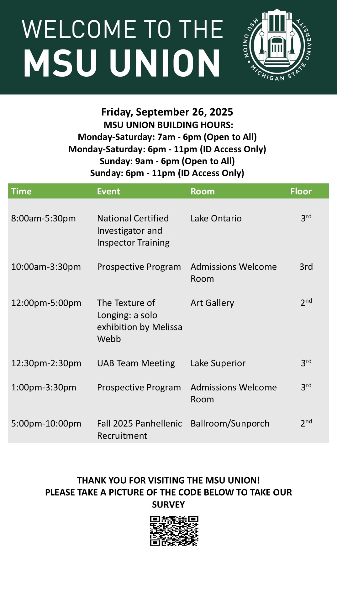 By spitzka, Thu, 09/18/2025 - 08:00 Creator: spitzka Area: MSU Union (Temp Schedule) Type: Academic Title: 9/26/2025 Subheader: Body Copy: Active Dates: Fri, 09/26/2025 - 05:00 - Fri, 09/26/2025 - 23:59 Preview
