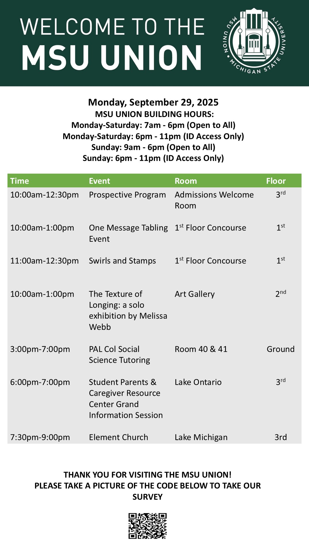 By spitzka, Fri, 09/26/2025 - 15:33 Creator: spitzka Area: MSU Union (Temp Schedule) Type: Academic Title: 9/29/2025 Subheader: Body Copy: Active Dates: Mon, 09/29/2025 - 05:00 - Mon, 09/29/2025 - 23:59 Preview