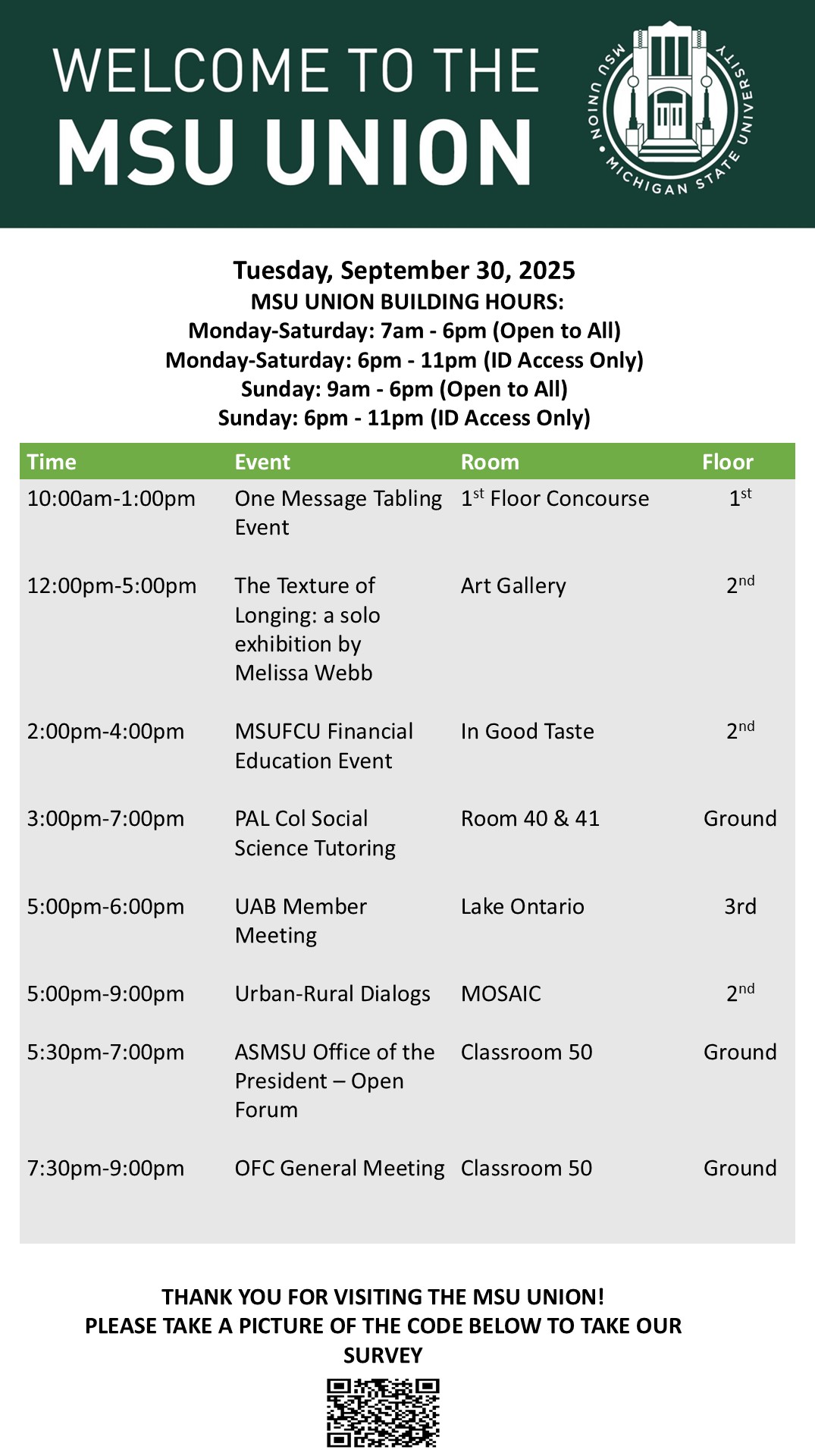 By spitzka, Mon, 09/29/2025 - 13:34 Creator: spitzka Area: MSU Union (Temp Schedule) Type: Academic Title: 9.30.2025 Subheader: Body Copy: Active Dates: Tue, 09/30/2025 - 05:00 - Tue, 09/30/2025 - 23:59 Preview