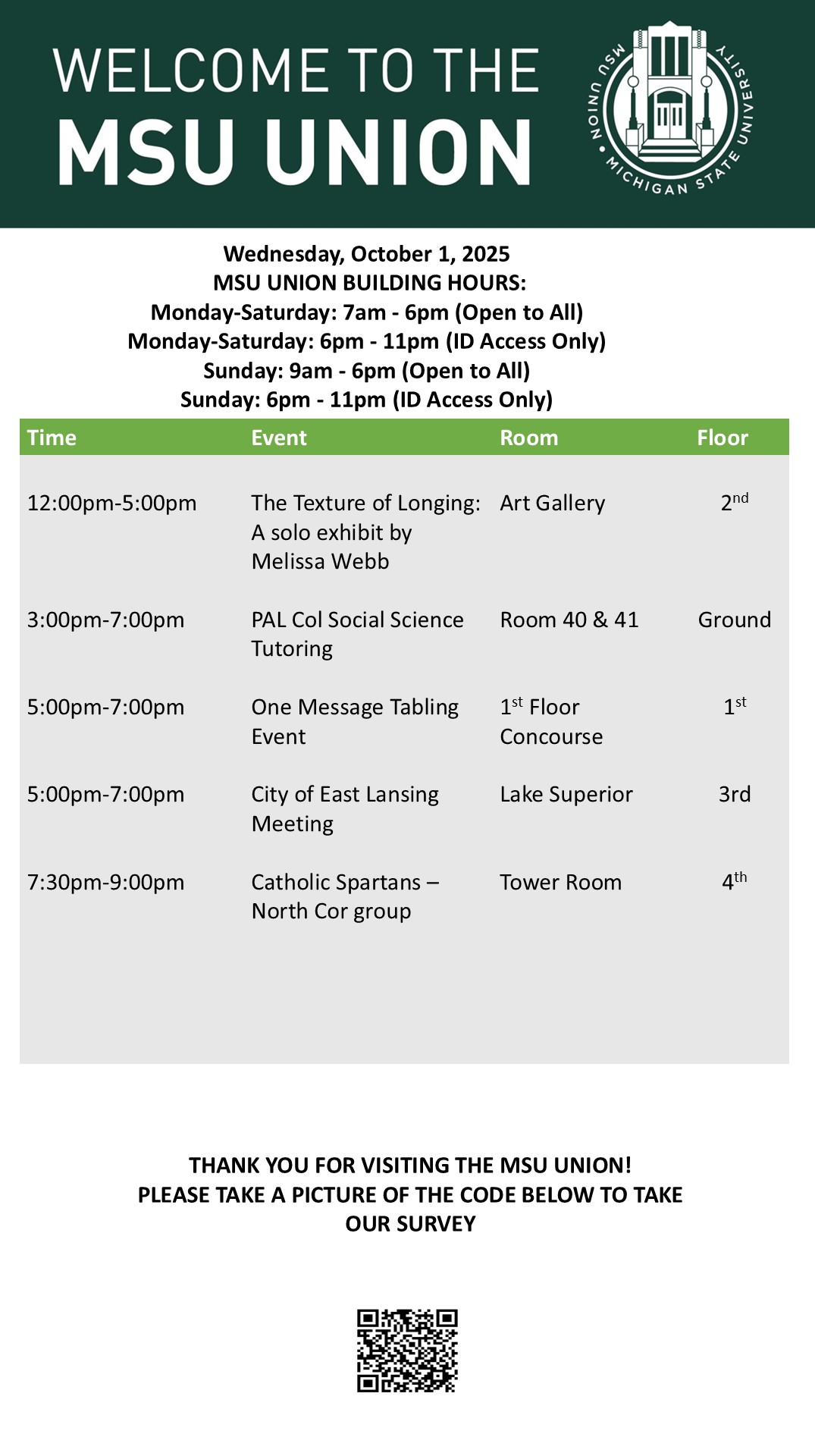 By spitzka, Mon, 09/29/2025 - 13:35 Creator: spitzka Area: MSU Union (Temp Schedule) Type: Academic Title: 10.1.2025 Subheader: Body Copy: Active Dates: Wed, 10/01/2025 - 05:00 - Wed, 10/01/2025 - 23:59 Preview