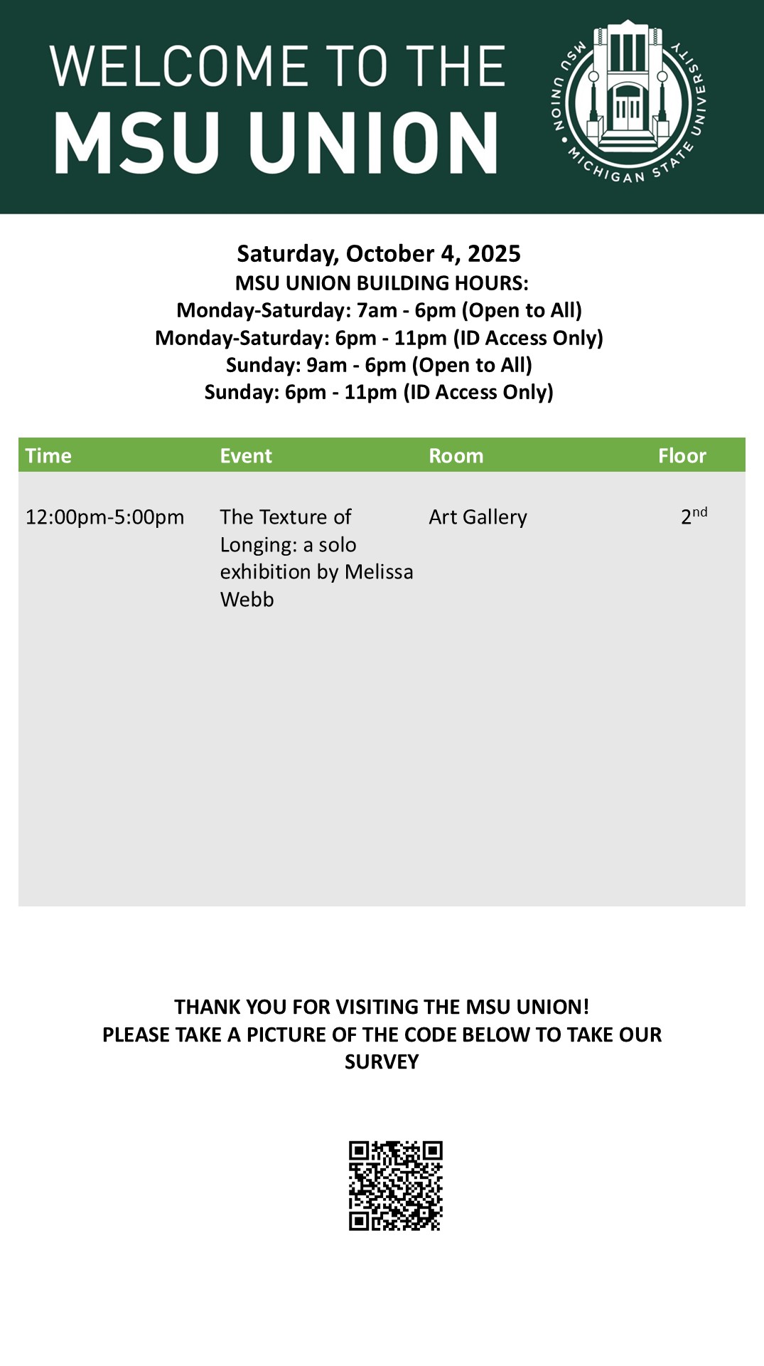 By spitzka, Tue, 09/30/2025 - 12:07 Creator: spitzka Area: MSU Union (Temp Schedule) Type: Academic Title: 10/04/2025 Subheader: Body Copy: Active Dates: Sat, 10/04/2025 - 05:00 - Sat, 10/04/2025 - 23:59 Preview