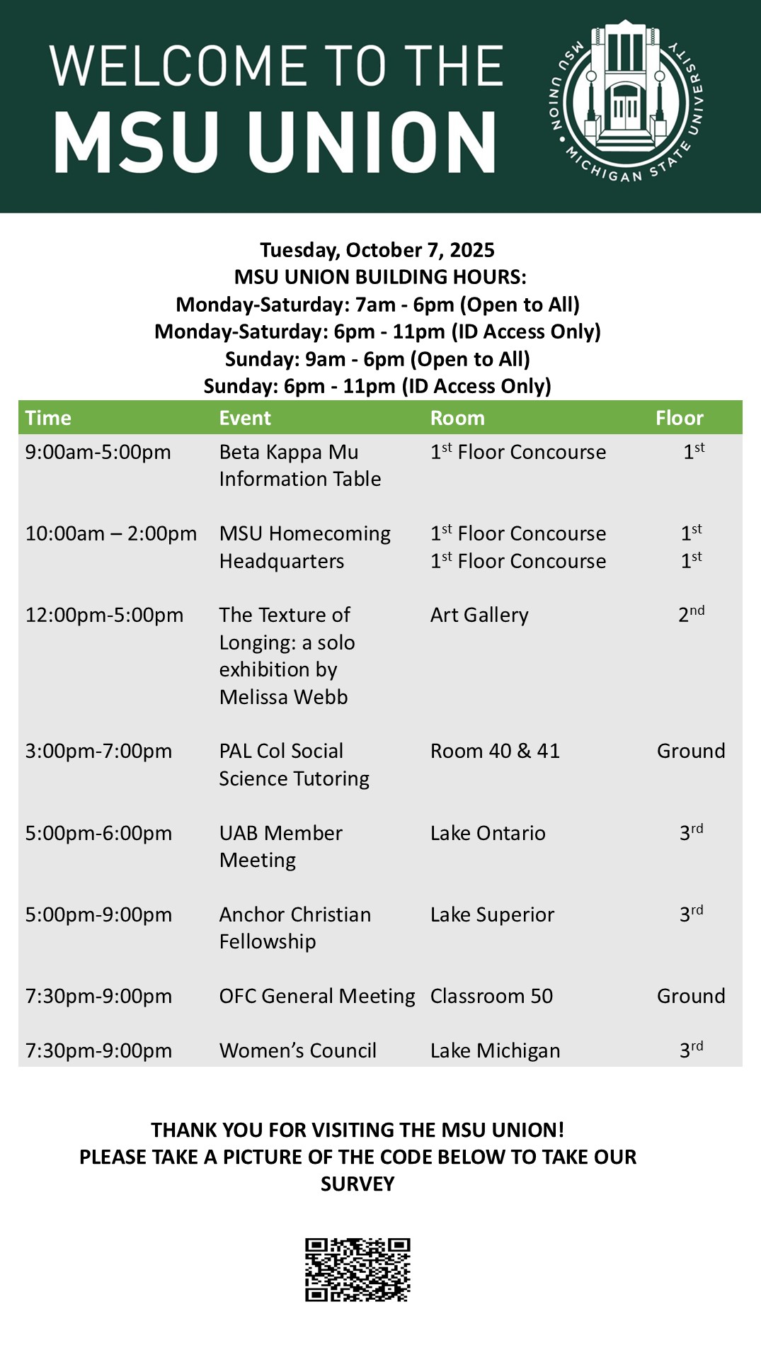 By spitzka, Mon, 10/06/2025 - 09:10 Creator: spitzka Area: MSU Union (Temp Schedule) Type: Academic Title: 10/7/2025 Subheader: Body Copy: Active Dates: Tue, 10/07/2025 - 05:00 - Tue, 10/07/2025 - 23:59 Preview