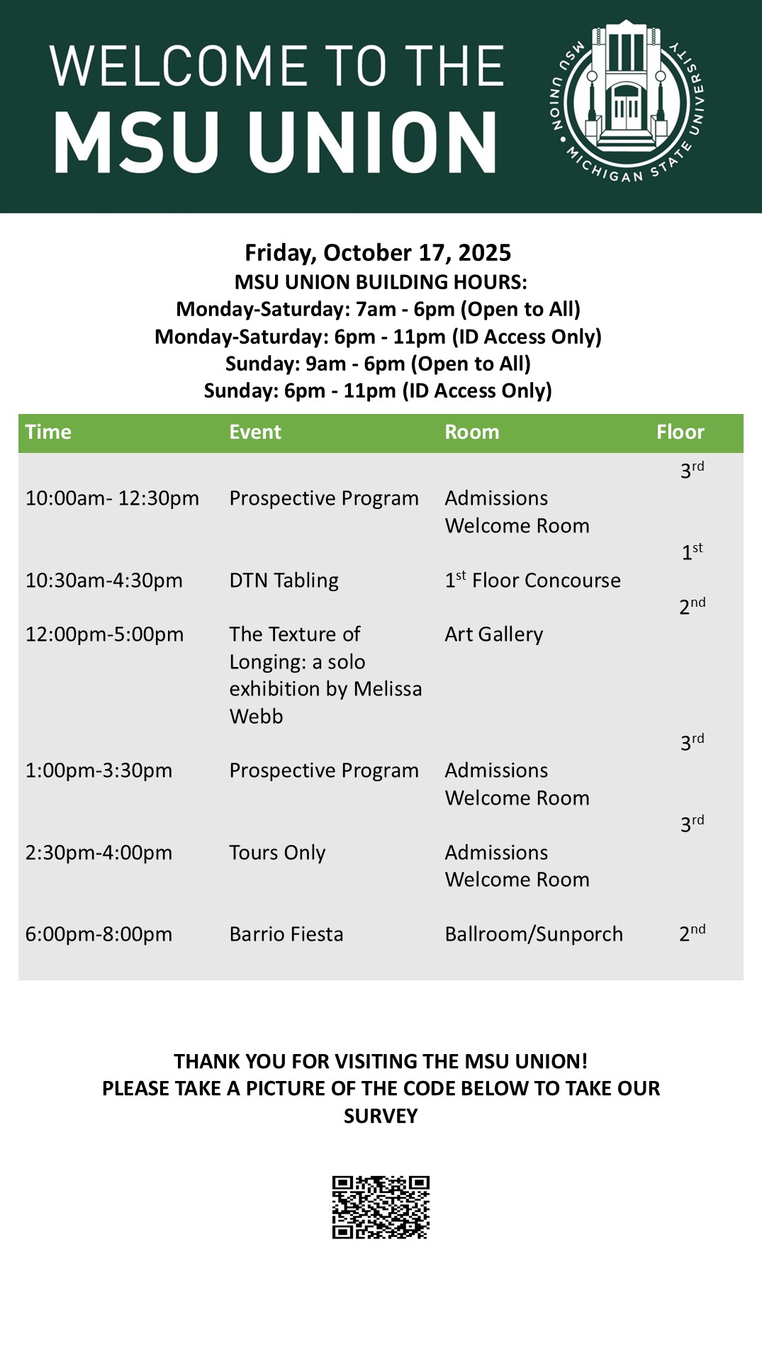 By spitzka, Mon, 10/13/2025 - 15:06 Creator: spitzka Area: MSU Union (Temp Schedule) Type: Academic Title: 10/17/2025 Subheader: Body Copy: Active Dates: Fri, 10/17/2025 - 05:00 - Fri, 10/17/2025 - 23:59 Preview