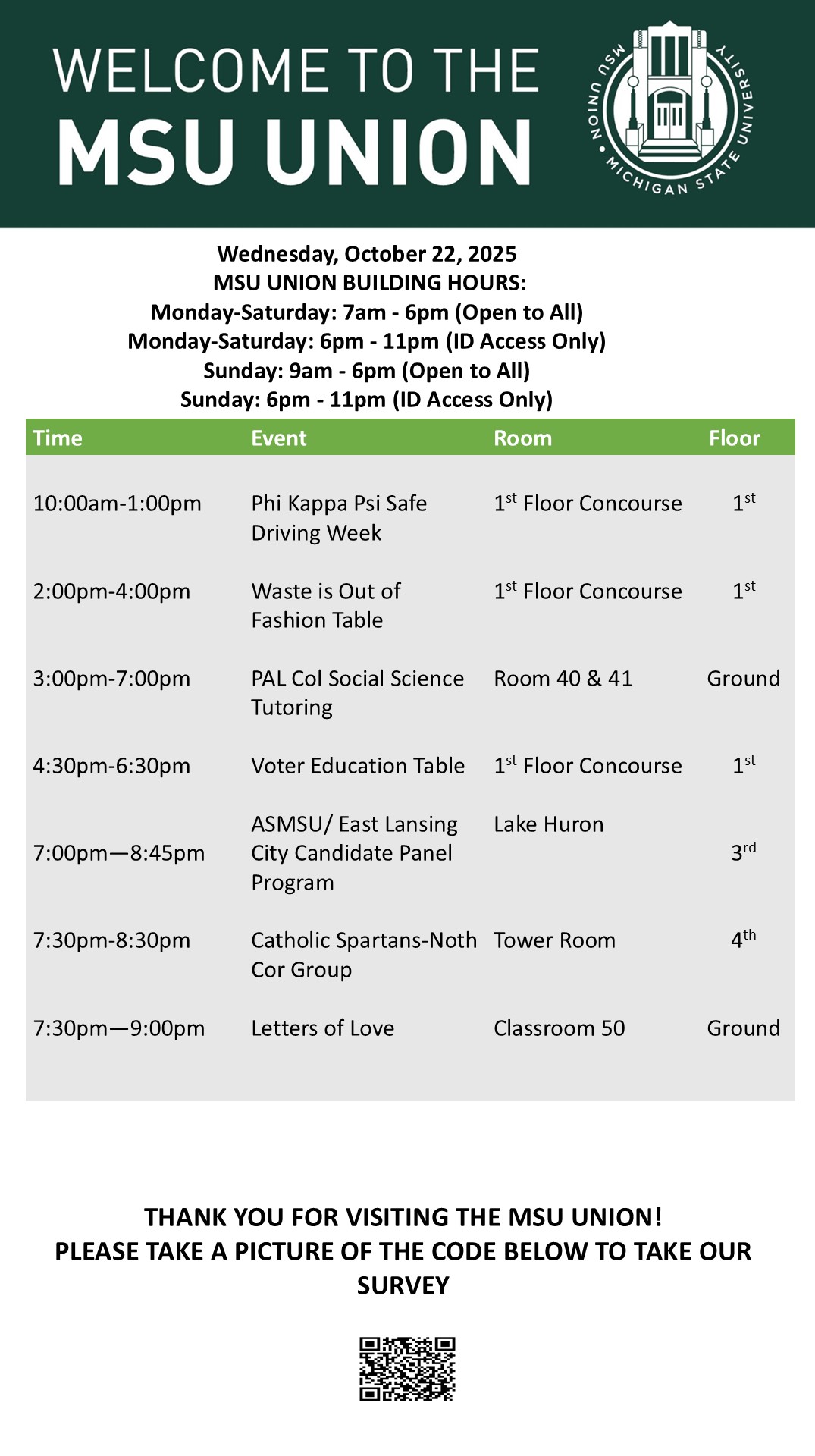 By spitzka, Mon, 10/20/2025 - 13:20 Creator: spitzka Area: MSU Union (Temp Schedule) Type: Academic Title: 10/22/2025 Subheader: Body Copy: Active Dates: Wed, 10/22/2025 - 05:00 - Wed, 10/22/2025 - 23:59 Preview