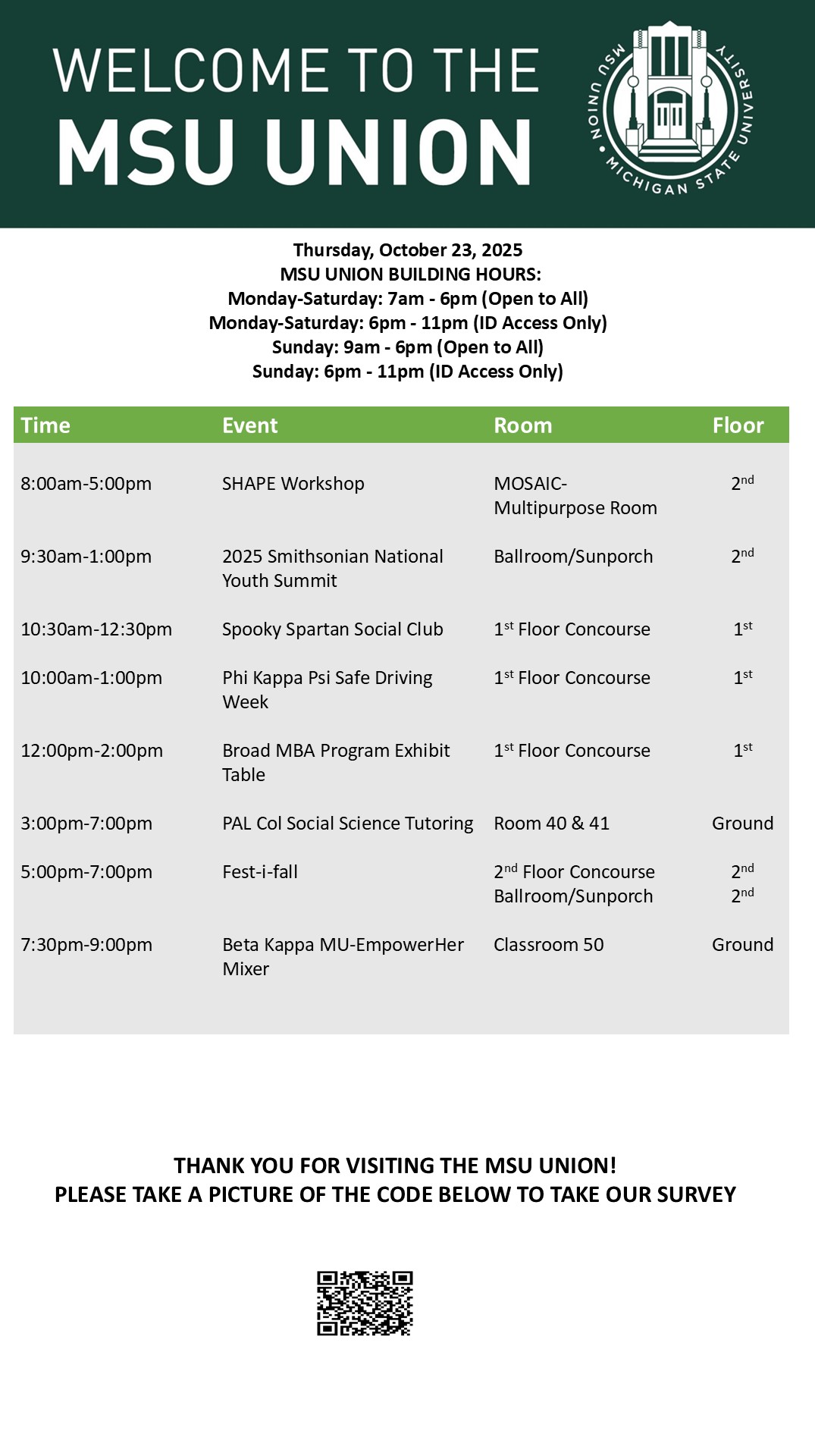 By spitzka, Mon, 10/20/2025 - 13:21 Creator: spitzka Area: MSU Union (Temp Schedule) Type: Academic Title: 10/23/2025 Subheader: Body Copy: Active Dates: Thu, 10/23/2025 - 05:00 - Thu, 10/23/2025 - 23:59 Preview