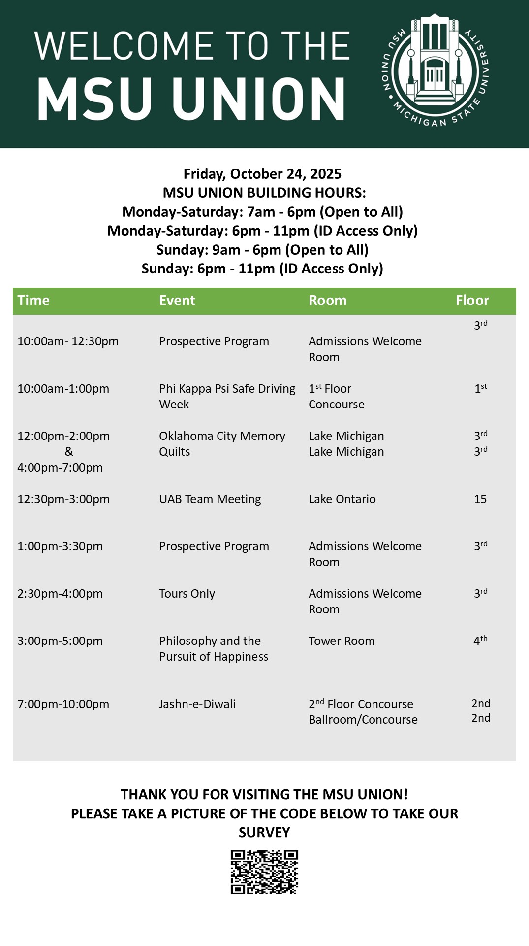 By spitzka, Mon, 10/20/2025 - 13:21 Creator: spitzka Area: MSU Union (Temp Schedule) Type: Academic Title: 10/24/2025 Subheader: Body Copy: Active Dates: Fri, 10/24/2025 - 05:00 - Fri, 10/24/2025 - 23:59 Preview