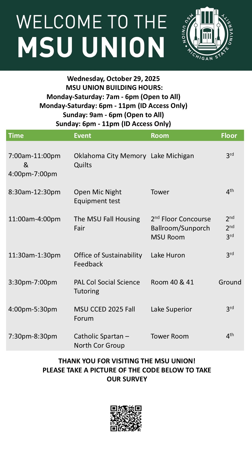 By spitzka, Fri, 10/24/2025 - 15:12 Creator: spitzka Area: MSU Union (Temp Schedule) Type: Academic Title: 10/29/2025 Subheader: Body Copy: Active Dates: Wed, 10/29/2025 - 05:00 - Wed, 10/29/2025 - 23:59 Preview
