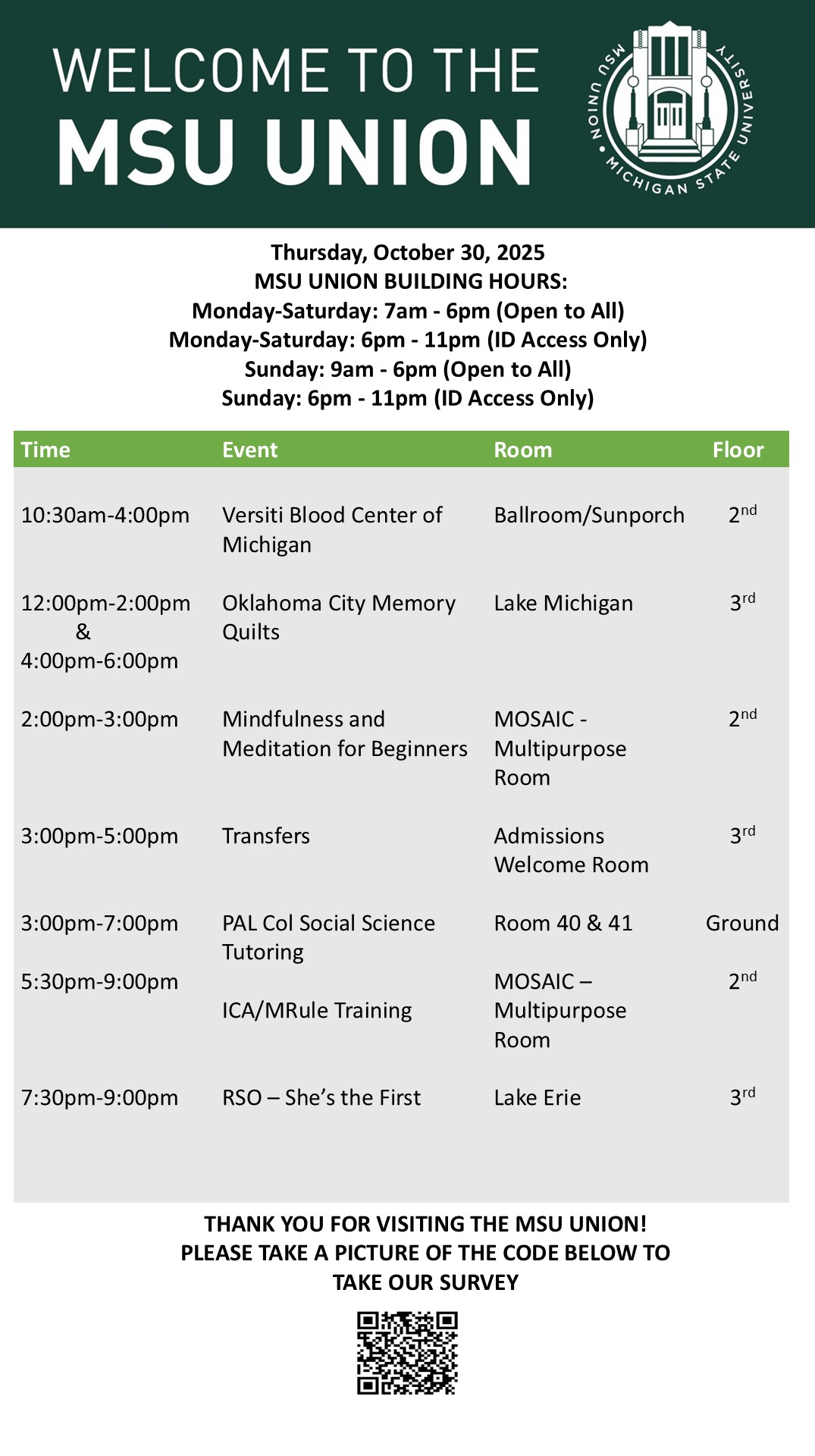By spitzka, Fri, 10/24/2025 - 15:12 Creator: spitzka Area: MSU Union (Temp Schedule) Type: Academic Title: 10/30/2025 Subheader: Body Copy: Active Dates: Thu, 10/30/2025 - 05:00 - Thu, 10/30/2025 - 23:59 Preview