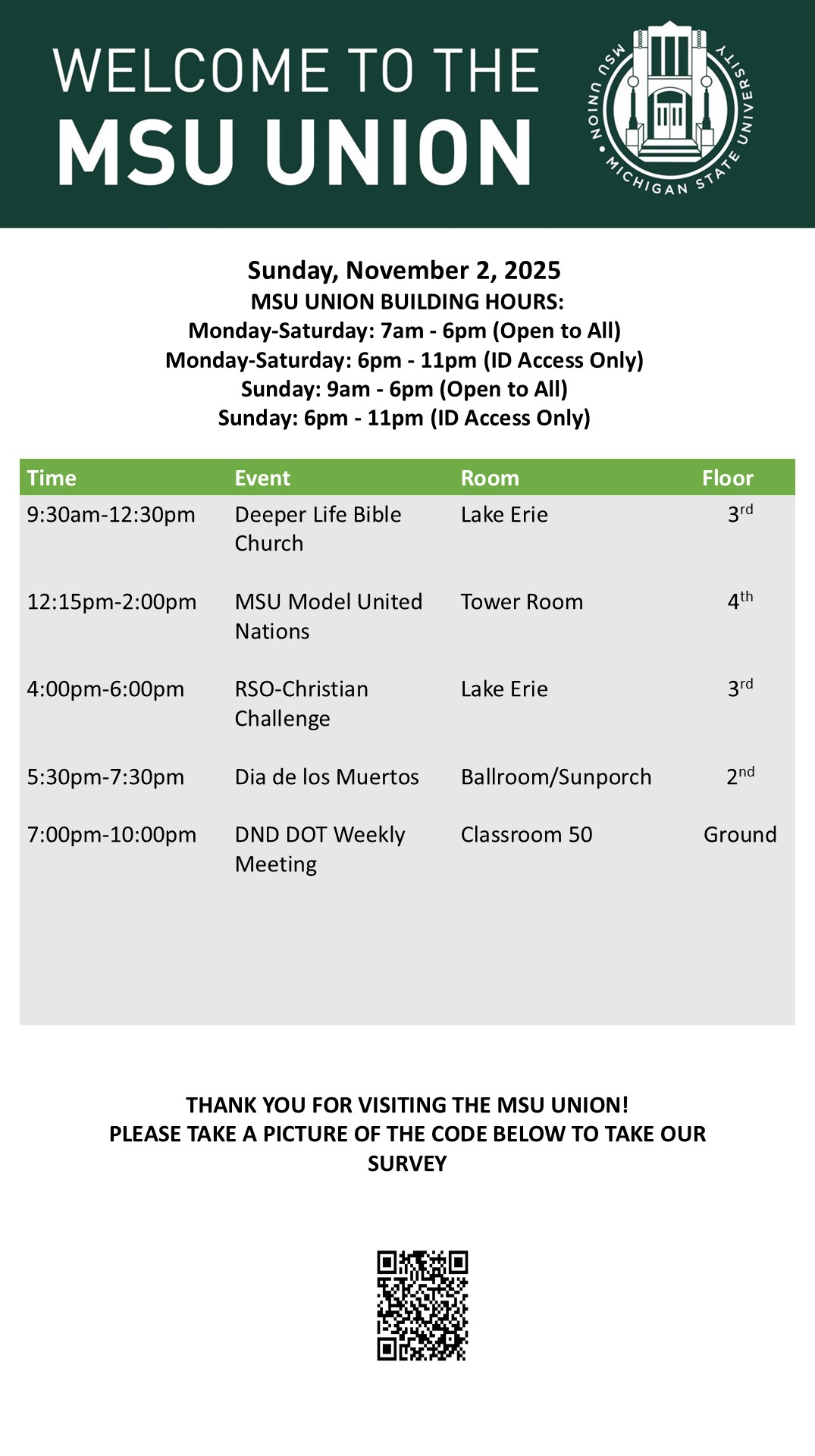 By spitzka, Fri, 10/24/2025 - 15:14 Creator: spitzka Area: MSU Union (Temp Schedule) Type: Academic Title: 11/2/2025 Subheader: Body Copy: Active Dates: Sun, 11/02/2025 - 05:00 - Sun, 11/02/2025 - 23:59 Preview