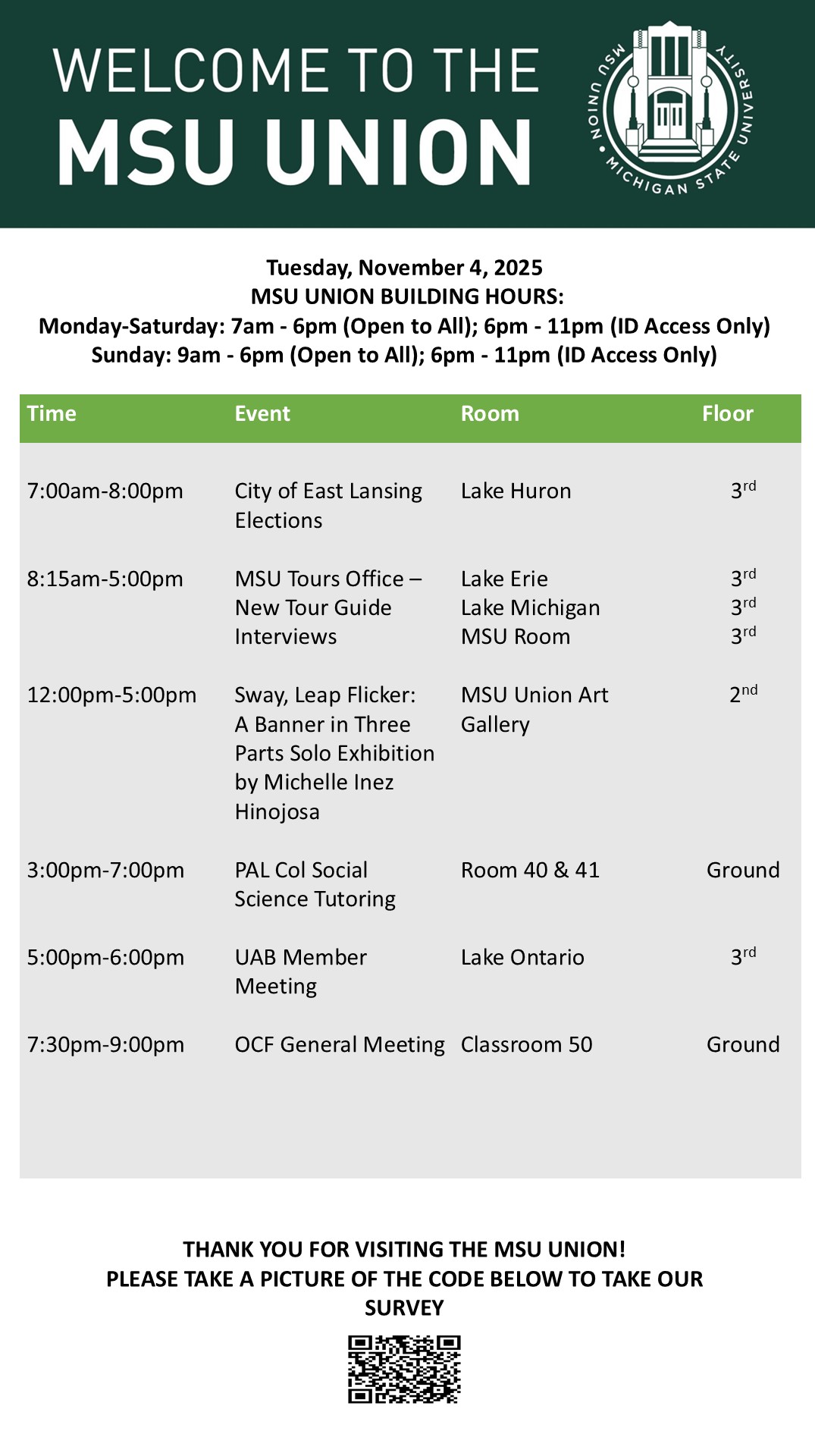 By spitzka, Fri, 10/31/2025 - 15:02 Creator: spitzka Area: MSU Union (Temp Schedule) Type: Academic Title: 11/4/2025 Subheader: Body Copy: Active Dates: Tue, 11/04/2025 - 05:00 - Tue, 11/04/2025 - 23:59 Preview